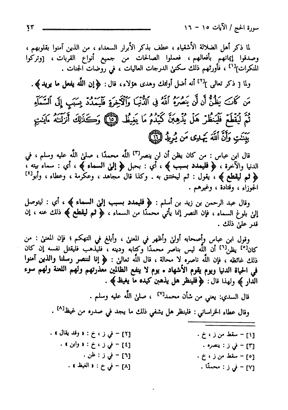 مَنْ كَانَ يَظُنُّ أَنْ لَنْ يَنْصُرَهُ اللَّهُ فِي الدُّنْيَا وَالْآَخِرَةِ فَلْيَمْدُدْ بِسَبَبٍ إِلَى السَّمَاءِ ثُمَّ لِيَقْطَعْ فَلْيَنْظُرْ هَلْ يُذْهِبَنَّ كَيْدُهُ مَا يَغِيظُ (15)