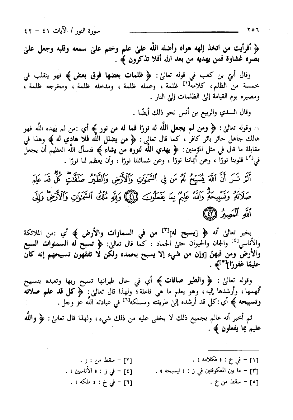 أَلَمْ تَرَ أَنَّ اللَّهَ يُسَبِّحُ لَهُ مَنْ فِي السَّمَاوَاتِ وَالْأَرْضِ وَالطَّيْرُ صَافَّاتٍ كُلٌّ قَدْ عَلِمَ صَلَاتَهُ وَتَسْبِيحَهُ وَاللَّهُ عَلِيمٌ بِمَا يَفْعَلُونَ (41)