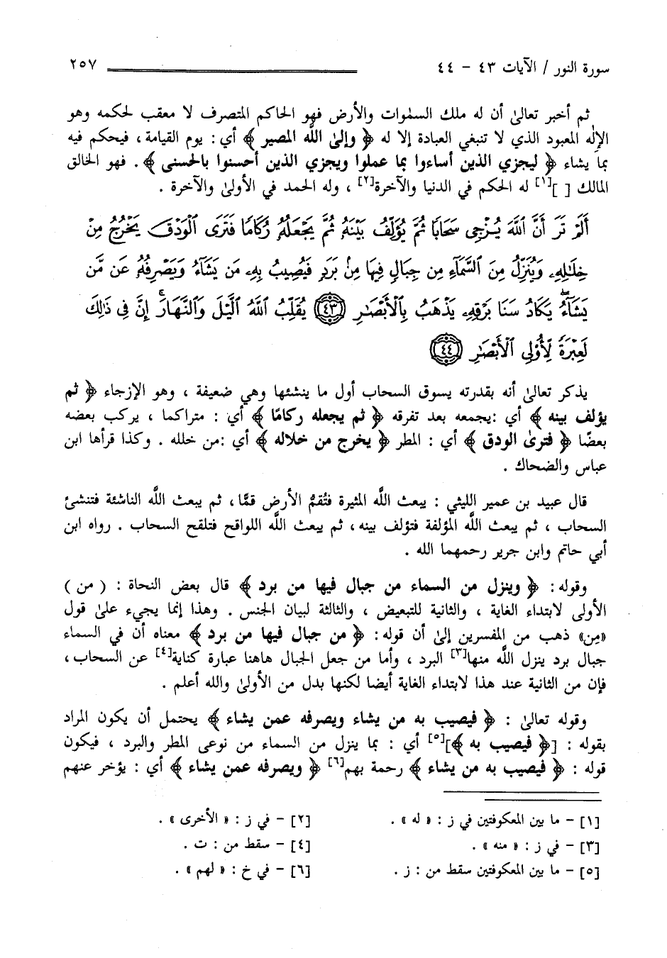 أَلَمْ تَرَ أَنَّ اللَّهَ يُزْجِي سَحَابًا ثُمَّ يُؤَلِّفُ بَيْنَهُ ثُمَّ يَجْعَلُهُ رُكَامًا فَتَرَى الْوَدْقَ يَخْرُجُ مِنْ خِلَالِهِ وَيُنَزِّلُ مِنَ السَّمَاءِ مِنْ جِبَالٍ فِيهَا مِنْ بَرَدٍ فَيُصِيبُ بِهِ مَنْ يَشَاءُ وَيَصْرِفُهُ عَنْ مَنْ يَشَاءُ يَكَادُ سَنَا بَرْقِهِ يَذْهَبُ بِالْأَبْصَارِ (43)