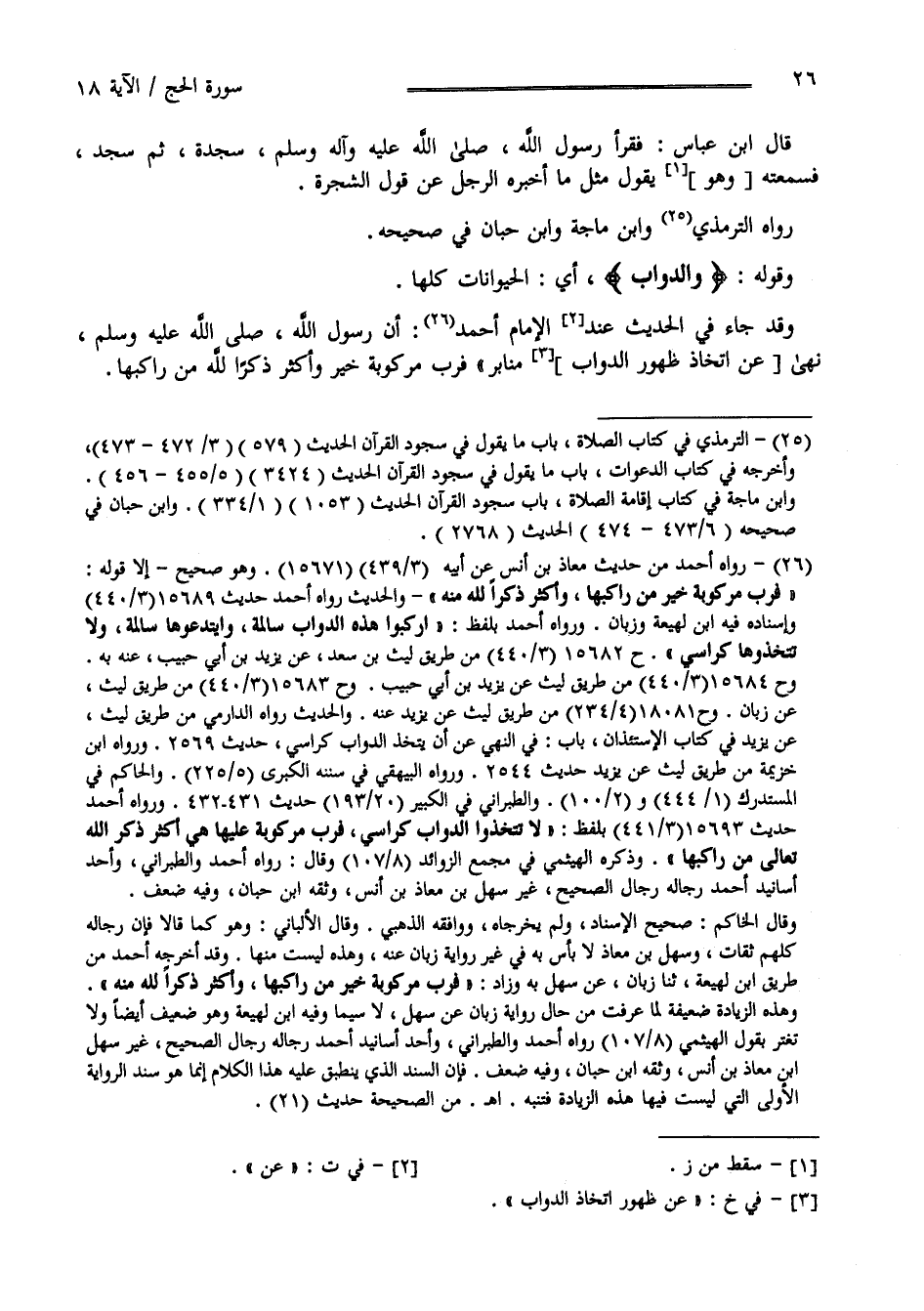 رَوَاهُ التِّرْمِذِيّ وَابْن مَاجَهْ وَابْن حِبَّان فِي صَحِيحه ; وَقَوْله " وَالدَّوَابّ" أَيْ : الْحَيَوَانَات كُلّهَا وَقَدْ جَاءَ فِي الْحَدِيث عَنْ الْإِمَام أَحْمَد أَنَّ رَسُول اللَّه صَلَّى اللَّه عَلَيْهِ وَسَلَّمَ نَهَى عَنْ اِتِّخَاذ ظُهُور الدَّوَابّ مَنَابِر فَرُبَّ مَرْكُوبَة خَيْرًا أَوْ أَكْثَر ذِكْرًا لِلَّهِ تَعَالَى مِنْ رَاكِبهَا