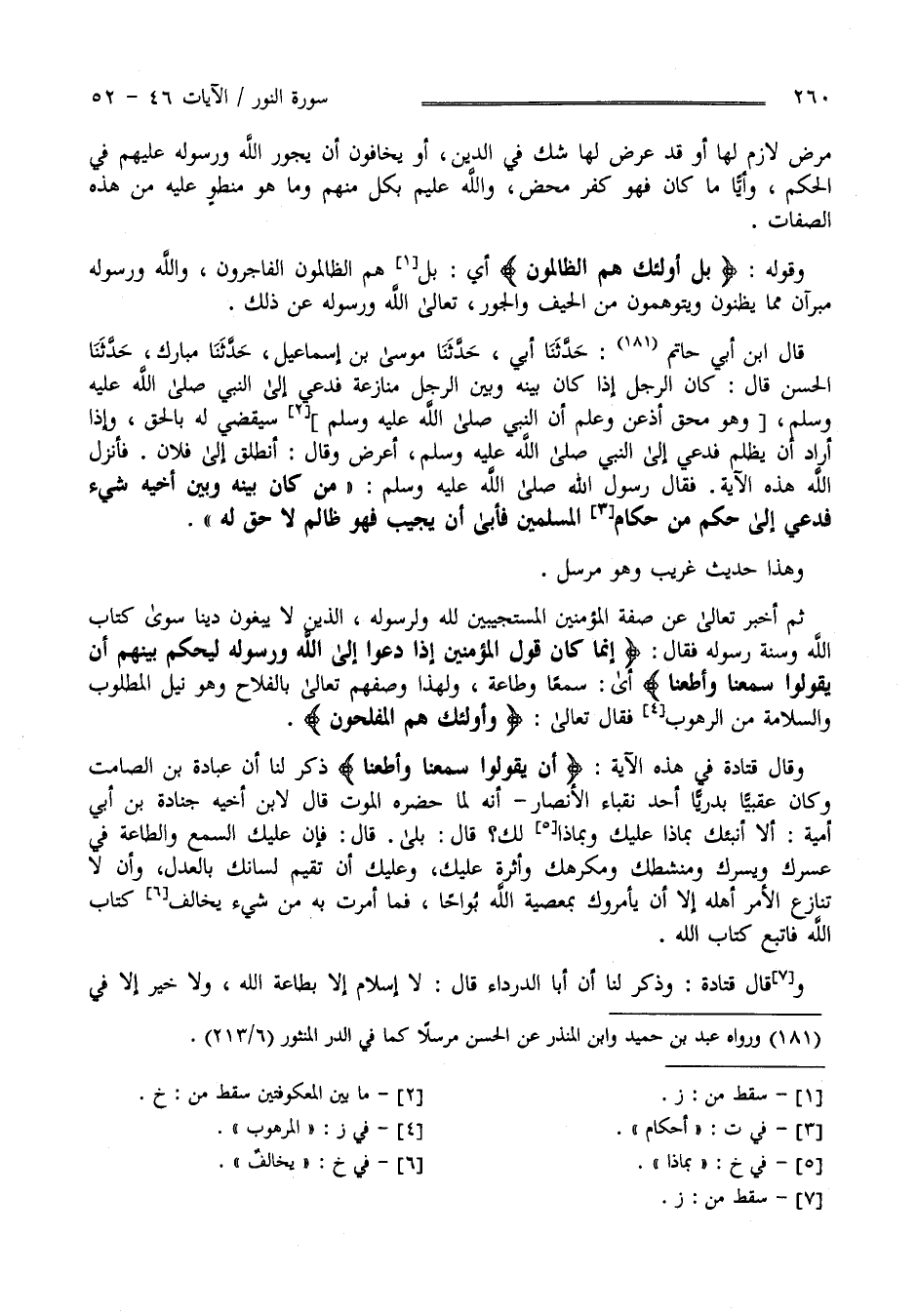 مَرَض لَازِم لَهَا أَوْقَدَ لَهَا شَكّ فِي الدِّين أَوْ يَخَافُونَ أَنْ يَجُور اللَّه وَرَسُوله عَلَيْهِمْ فِي الْحُكْم وَأَيًّا مَا كَانَ فَهُوَ كُفْر مَحْض وَاَللَّه عَلِيم بِكُلٍّ مِنْهُمْ وَمَا هُوَ مُنْطَوٍ عَلَيْهِ مِنْ هَذِهِ الصِّفَات وَقَوْله تَعَالَى " بَلْ أُولَئِكَ هُمْ الظَّالِمُونَ " أَيْ بَلْ هُمْ الظَّالِمُونَ الْفَاجِرُونَ وَاَللَّه وَرَسُوله مُبَرَّآنِ مِمَّا يَظُنُّونَ وَمُتَوَهِّمُونَ مِنْ الْحَيْف وَالْجَوْر تَعَالَى اللَّه وَرَسُوله عَنْ ذَلِكَ قَالَ اِبْن أَبِي حَاتِم : حَدَّثَنَا أَبِي حَدَّثَنَا مُوسَى بْن إِسْمَاعِيل حَدَّثَنَا مُبَارَك حَدَّثَنَا الْحَسَن قَالَ : كَانَ الرَّجُل إِذَا كَانَ بَيْنه وَبَيْن الرَّجُل مُنَازَعَة فَدُعِيَ إِلَى النَّبِيّ صَلَّى اللَّه عَلَيْهِ وَسَلَّمَ وَهُوَ مُحِقّ أَذْعَنَ وَعَلِمَ أَنَّ النَّبِيّ صَلَّى اللَّه عَلَيْهِ وَسَلَّمَ سَيَقْضِي لَهُ بِالْحَقِّ وَإِذَا أَرَادَ أَنْ يَظْلِم فَدُعِيَ إِلَى النَّبِيّ صَلَّى اللَّه عَلَيْهِ وَسَلَّمَ أَعْرَضَ وَقَالَ أَنْطَلِق إِلَى فُلَان فَأَنْزَلَ اللَّه هَذِهِ الْآيَة فَقَالَ النَّبِيّ صَلَّى اللَّه عَلَيْهِ وَسَلَّمَ : " مَنْ كَانَ بَيْنه وَبَيْن أَخِيهِ شَيْء فَدُعِيَ إِلَى حُكْم مِنْ أَحْكَام الْمُسْلِمِينَ فَأَبَى أَنْ يُجِيب فَهُوَ ظَالِم لَا حَقّ لَهُ " وَهَذَا حَدِيث غَرِيب وَهُوَ مُرْسَل ثُمَّ أَخْبَرَ تَعَالَى عَنْ صِفَة الْمُؤْمِنِينَ الْمُسْتَجِيبِينَ لِلَّهِ وَلِرَسُولِهِ الَّذِينَ لَا يَبْغُونَ دِينًا سِوَى كِتَاب اللَّه وَسُنَّة رَسُوله.