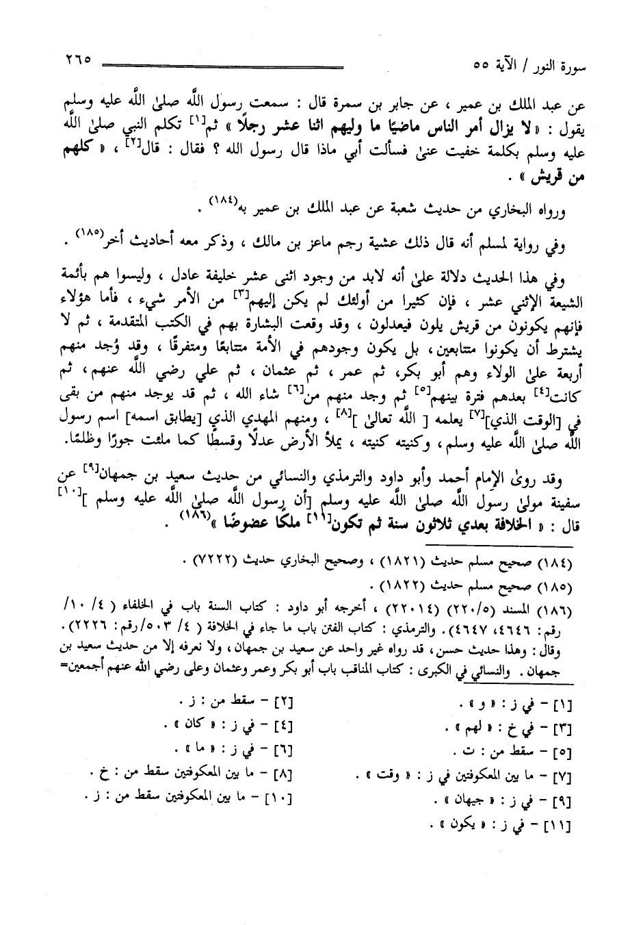 عَنْ عَبْد الْمَلِك بْن عُمَيْر عَنْ جَابِر بْن سَمُرَة قَالَ : سَمِعْت رَسُول اللَّه صَلَّى اللَّه عَلَيْهِ وَسَلَّمَ يَقُول : " لَا يَزَال أَمْر النَّاس مَاضِيًا مَا وَلِيَهُمْ اِثْنَا عَشَر رَجُلًا " ثُمَّ تَكَلَّمَ النَّبِيّ صَلَّى اللَّه عَلَيْهِ وَسَلَّمَ بِكَلِمَةٍ خَفِيَتْ عَنِّي فَسَأَلْت أَبِي مَاذَا قَالَ رَسُول اللَّه صَلَّى اللَّه عَلَيْهِ وَسَلَّمَ ؟ فَقَالَ قَالَ : " كُلّهمْ مِنْ قُرَيْش " وَرَوَاهُ الْبُخَارِيّ مِنْ حَدِيث شُعْبَة عَنْ عَبْد الْمَلِك بْن عُمَيْر بِهِ وَفِي رِوَايَة لِمُسْلِمٍ أَنَّهُ قَالَ ذَلِكَ عَشِيَّة رَجْم مَاعِز بْن مَالِك وَذَكَرَ مَعَهُ أَحَادِيث أُخَر وَفِي هَذَا الْحَدِيث دَلَالَة عَلَى أَنَّهُ لَا بُدّ مِنْ وُجُود اِثْنَيْ عَشَر خَلِيفَة عَادِل وَلَيْسُوا هُمْ بِأَئِمَّةِ الشِّيعَة الِاثْنَيْ عَشَر فَإِنَّ كَثِيرًا مِنْ أُولَئِكَ لَمْ يَكُنْ لَهُمْ مِنْ الْأَمْر شَيْء فَأَمَّا هَؤُلَاءِ فَإِنَّهُمْ يَكُونُونَ مِنْ قُرَيْش يَلُونَ فَيَعْدِلُونَ وَقَدْ وَقَعَتْ الْبِشَارَة بِهِمْ فِي الْكُتُب الْمُتَقَدِّمَة ثُمَّ لَا يُشْتَرَط أَنْ يَكُون مُتَتَابِعِينَ بَلْ يَكُون وُجُودهمْ فِي الْأُمَّة مُتَتَابِعًا وَمُتَفَرِّقًا وَقَدْ وُجِدَ مِنْهُمْ أَرْبَعَة عَلَى الْوَلَاء وَهُمْ أَبُو بَكْر ثُمَّ عُمَر ثُمَّ عُثْمَان ثُمَّ عَلِيّ رَضِيَ اللَّه عَنْهُمْ ثُمَّ كَانَتْ بَعْدهمْ فَتْرَة ثُمَّ وُجِدَ مِنْهُمْ مَنْ شَاءَ اللَّه ثُمَّ قَدْ يُوجَد مِنْهُمْ مَنْ بَقِيَ فِي الْوَقْت الَّذِي يَعْلَمهُ اللَّه تَعَالَى وَمِنْهُمْ الْمَهْدِيّ الَّذِي اِسْمه يُطَابِق اِسْم رَسُول اللَّه صَلَّى اللَّه عَلَيْهِ وَسَلَّمَ وَكُنْيَته كُنْيَته يَمْلَأ الْأَرْض عَدْلًا وَقِسْطًا كَمَا مُلِئَتْ جَوْرًا وَظُلْمًا وَقَدْ رَوَى الْإِمَام أَحْمَد وَأَبُو دَاوُد وَالتِّرْمِذِيّ وَالنَّسَائِيّ مِنْ حَدِيث سَعِيد بْن جَهْمَان عَنْ سَفِينَة مَوْلَى رَسُول اللَّه صَلَّى اللَّه عَلَيْهِ وَسَلَّمَ أَنَّ رَسُول اللَّه صَلَّى اللَّه عَلَيْهِ وَسَلَّمَ قَالَ : " الْخِلَافَة بَعْدِي ثَلَاثُونَ سَنَة ثُمَّ تَكُون مُلْكًا عَضُوضًا
