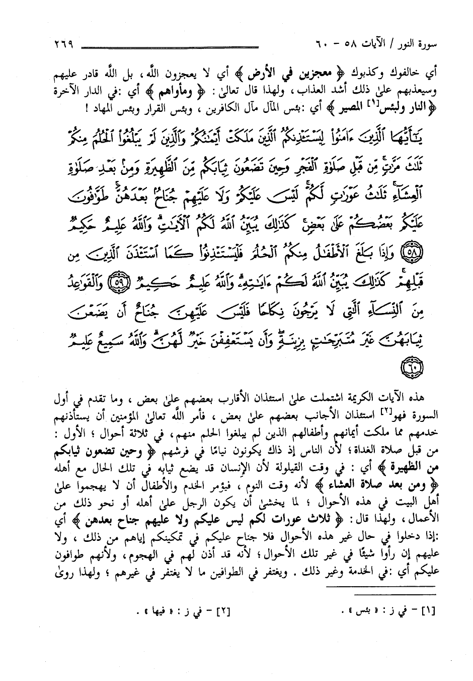 يَا أَيُّهَا الَّذِينَ آَمَنُوا لِيَسْتَأْذِنْكُمُ الَّذِينَ مَلَكَتْ أَيْمَانُكُمْ وَالَّذِينَ لَمْ يَبْلُغُوا الْحُلُمَ مِنْكُمْ ثَلَاثَ مَرَّاتٍ مِنْ قَبْلِ صَلَاةِ الْفَجْرِ وَحِينَ تَضَعُونَ ثِيَابَكُمْ مِنَ الظَّهِيرَةِ وَمِنْ بَعْدِ صَلَاةِ الْعِشَاءِ ثَلَاثُ عَوْرَاتٍ لَكُمْ لَيْسَ عَلَيْكُمْ وَلَا عَلَيْهِمْ جُنَاحٌ بَعْدَهُنَّ طَوَّافُونَ عَلَيْكُمْ بَعْضُكُمْ عَلَى بَعْضٍ كَذَلِكَ يُبَيِّنُ اللَّهُ لَكُمُ الْآَيَاتِ وَاللَّهُ عَلِيمٌ حَكِيمٌ (58)
