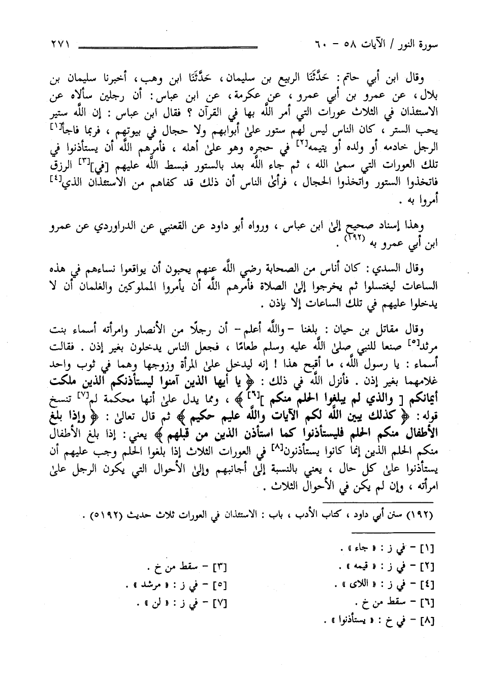 وَقَالَ اِبْن أَبِي حَاتِم حَدَّثَنَا الرَّبِيع بْن سُلَيْمَان حَدَّثَنَا اِبْن وَهْب أَخْبَرَنَا سُلَيْمَان بْن بِلَال عَنْ عَمْرو بْن أَبِي عَمْرو عَنْ عِكْرِمَة عَنْ اِبْن عَبَّاس أَنَّ رَجُلَيْنِ سَأَلَاهُ عَنْ الِاسْتِئْذَان فِي الثَّلَاث عَوْرَات الَّتِي أَمَرَ اللَّه بِهَا فِي الْقُرْآن فَقَالَ اِبْن عَبَّاس : " إِنَّ اللَّه سِتِّير يُحِبّ السَّتْر كَانَ النَّاس لَيْسَ لَهُمْ سُطُور عَلَى أَبْوَابهمْ وَلَا حِجَال فِي بُيُوتهمْ فَرُبَّمَا فَاجَأَ الرَّجُل خَادِمه أَوْ وَلَده أَوْ يَتِيمه فِي حِجْره وَهُوَ عَلَى أَهْله فَأَمَرَهُمْ اللَّه أَنْ يَسْتَأْذِنُوا فِي تِلْكَ الْعَوْرَات الَّتِي سَمَّى اللَّه ثُمَّ جَاءَ اللَّه بَعْد بِالسُّتُورِ فَبَسَطَ اللَّه عَلَيْهِمْ الرِّزْق فَاِتَّخَذُوا السُّتُور وَاِتَّخَذُوا الْحِجَال فَرَأَى النَّاس أَنَّ ذَلِكَ قَدْ كَفَاهُمْ مِنْ الِاسْتِئْذَان الَّذِي أُمِرُوا بِهِ " وَهَذَا إِسْنَاد صَحِيح إِلَى اِبْن عَبَّاس وَرَوَاهُ أَبُو دَاوُد عَنْ الْقَعْنَبِيّ عَنْ الدَّرَاوَرْدِيّ عَنْ عَمْرو بْن أَبِي عَمْرو بِهِ : وَقَالَ السُّدِّيّ كَانَ أُنَاس مِنْ الصَّحَابَة رَضِيَ اللَّه عَنْهُمْ يُحِبُّونَ أَنْ