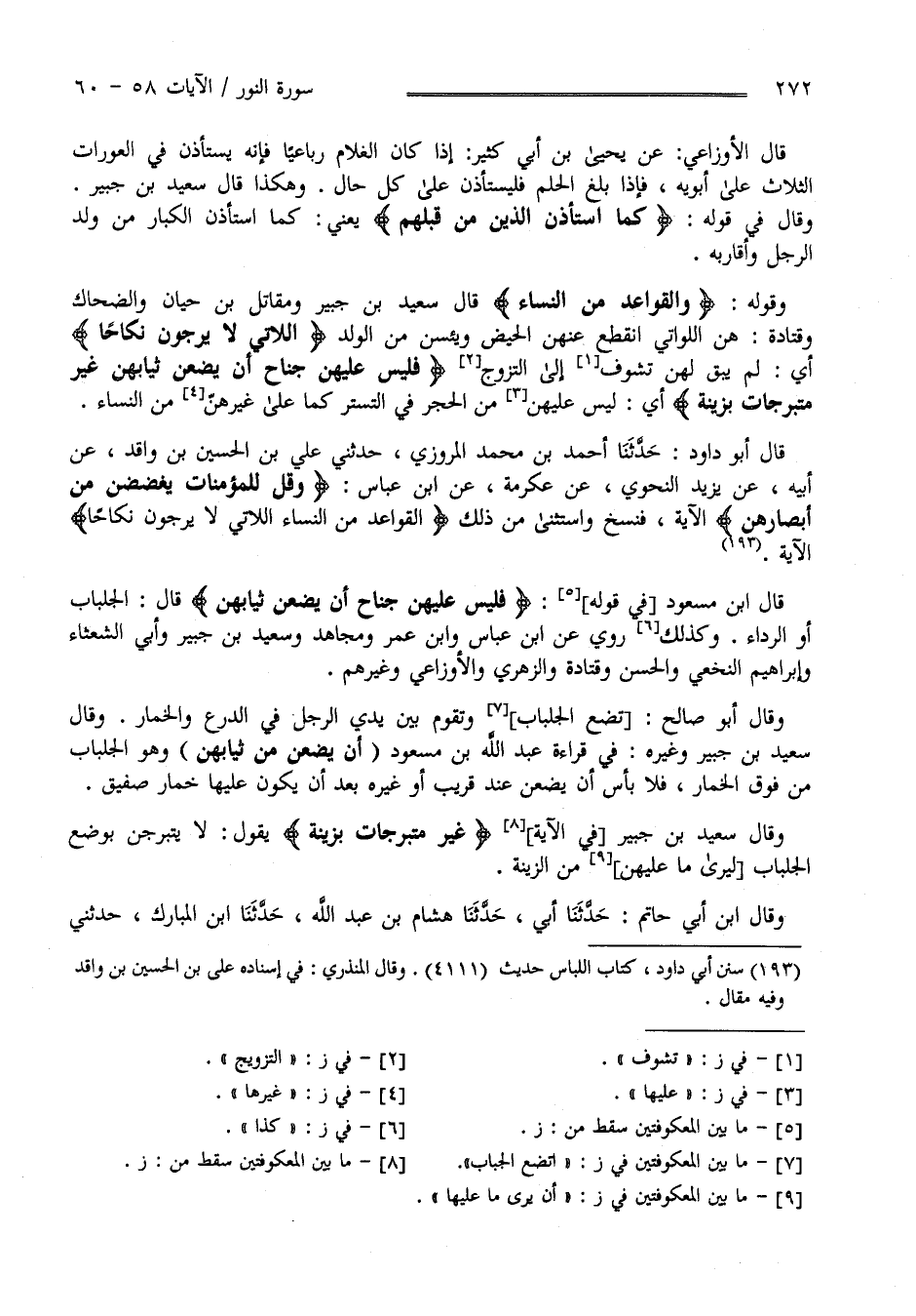قَالَ سَعِيد بْن جُبَيْر وَمُقَاتِل بْن حَيَّان وَالضَّحَّاك وَقَتَادَة : هُنَّ اللَّوَاتِي اِنْقَطَعَ عَنْهُنَّ الْحَيْض وَيَئِسْنَ مِنْ الْوَلَد " اللَّاتِي لَا يَرْجُونَ نِكَاحًا " أَيْ لَمْ يَبْقَ لَهُنَّ تَشَوُّف إِلَى التَّزَوُّج " فَلَيْسَ عَلَيْهِنَّ جُنَاح أَنْ يَضَعْنَ ثِيَابهنَّ غَيْر مُتَبَرِّجَات بِزِينَةٍ " أَيْ لَيْسَ عَلَيْهِمْ مِنْ الْحَجْر فِي التَّسَتُّر كَمَا عَلَى غَيْرهنَّ مِنْ النِّسَاء قَالَ أَبُو دَاوُد حَدَّثَنَا أَحْمَد بْن مُحَمَّد الْمَرْوَزِيّ حَدَّثَنِي عَلِيّ بْن الْحُسَيْن بْن وَاقِد عَنْ أَبِيهِ عَنْ يَزِيد النَّحْوِيّ عَنْ عِكْرِمَة عَنْ اِبْن عَبَّاس " وَقُلْ لِلْمُؤْمِنَاتِ يَغْضُضْنَ مِنْ أَبْصَارهنَّ " الْآيَة فَنَسَخَ مِنْ ذَلِكَ وَاسْتَثْنَى مِنْ ذَلِكَ " الْقَوَاعِد مِنْ النِّسَاء اللَّاتِي لَا يَرْجُونَ نِكَاحًا " الْآيَة قَالَ اِبْن مَسْعُود فِي قَوْله " فَلَيْسَ عَلَيْهِنَّ جُنَاح أَنْ يَضَعْنَ ثِيَابهنَّ " قَالَ : الْجِلْبَاب أَوْ الرِّدَاء وَكَذَلِكَ رُوِيَ عَنْ اِبْن عَبَّاس وَابْن عُمَر وَمُجَاهِد وَسَعِيد بْن جُبَيْر وَأَبِي الشَّعْثَاء وَإِبْرَاهِيم النَّخَعِيّ وَالْحَسَن وَقَتَادَة وَالزُّهْرِيّ وَالْأَوْزَاعِيّ وَغَيْرهمْ وَقَالَ أَبُو صَالِح : تَضَع الْجِلْبَاب وَتَقُوم بَيْن يَدَيْ الرَّجُل فِي الدِّرْع وَالْخِمَار وَقَالَ سَعِيد بْن جُبَيْر وَغَيْره فِي قِرَاءَة عَبْد اللَّه بْن مَسْعُود " أَنْ يَضَعْنَ مِنْ ثِيَابهنَّ " وَهُوَ الْجِلْبَاب مِنْ فَوْق الْخِمَار فَلَا بَأْس أَنْ يَضَعْنَ عِنْد غَرِيب أَوْ غَيْره بَعْد أَنْ يَكُون عَلَيْهَا خِمَار صَفِيق وَقَالَ سَعِيد بْن جُبَيْر فِي الْآيَة " غَيْر مُتَبَرِّجَات بِزِينَةٍ " يَقُول : لَا يَتَبَرَّجْنَ بِوَضْعِ الْجِلْبَاب لِيُرَى مَا عَلَيْهِنَّ مِنْ الزِّينَة وَقَالَ اِبْن أَبِي حَاتِم حَدَّثَنَا أَبِي حَدَّثَنَا هِشَام بْن عَبْد اللَّه حَدَّثَنَا اِبْن الْمُبَارَك حَدَّثَنِي