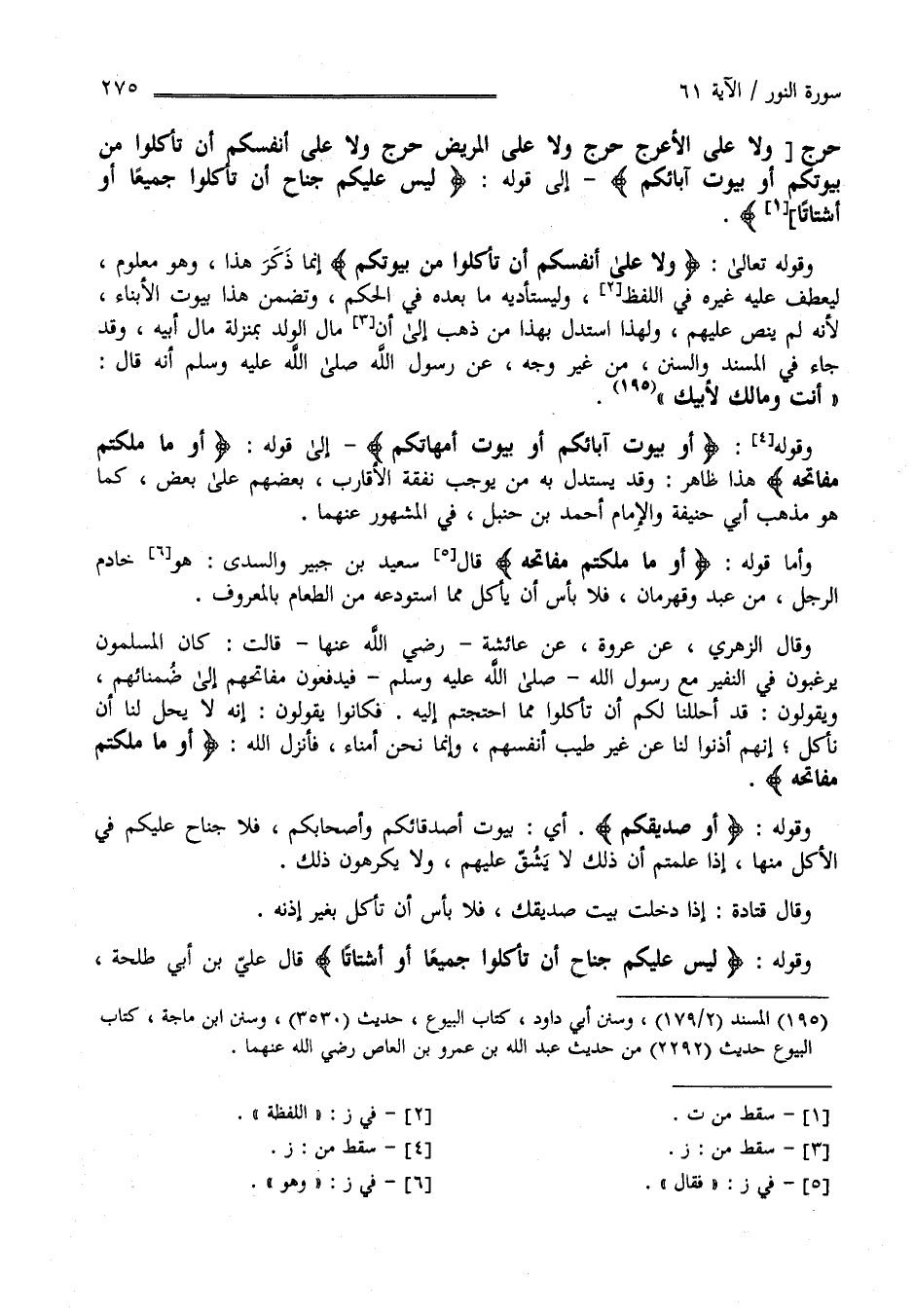 وَقَوْله تَعَالَى " وَلَا عَلَى أَنْفُسكُمْ أَنْ تَأْكُلُوا مِنْ بُيُوتكُمْ " إِنَّمَا ذَكَرَ هَذَا وَهُوَ مَعْلُوم لِيَعْطِف عَلَيْهِ غَيْره فِي اللَّفْظ وَلِيُسَاوِي بِهِ مَا بَعْده فِي الْحُكْم وَتَضَمَّنَ هَذَا بُيُوت الْأَبْنَاء لِأَنَّهُ لَمْ يَنُصّ عَلَيْهِمْ وَلِهَذَا اِسْتَدَلَّ بِهَذَا مَنْ ذَهَبَ إِلَى أَنَّ مَال الْوَلَد بِمَنْزِلِهِ مَال أَبِيهِ وَقَدْ جَاءَ فِي الْمُسْنَد وَالسُّنَن مِنْ غَيْر وَجْه عَنْ رَسُول اللَّه صَلَّى اللَّه عَلَيْهِ وَسَلَّمَ أَنَّهُ قَالَ : " أَنْتَ وَمَالك لِأَبِيك " وَقَوْله : " أَوْ بُيُوت آبَائِكُمْ أَوْ بُيُوت أُمَّهَاتكُمْ - إِلَى قَوْله - أَوْ مَا مَلَكْتُمْ مَفَاتِحه " هَذَا ظَاهِر وَقَدْ يَسْتَدِلّ بِهِ مَنْ يُوجِب نَفَقَة الْأَقَارِب بَعْضهمْ عَلَى بَعْض كَمَا هُوَ مَذْهَب أَبِي حَنِيفَة وَالْإِمَام أَحْمَد بْن حَنْبَل فِي