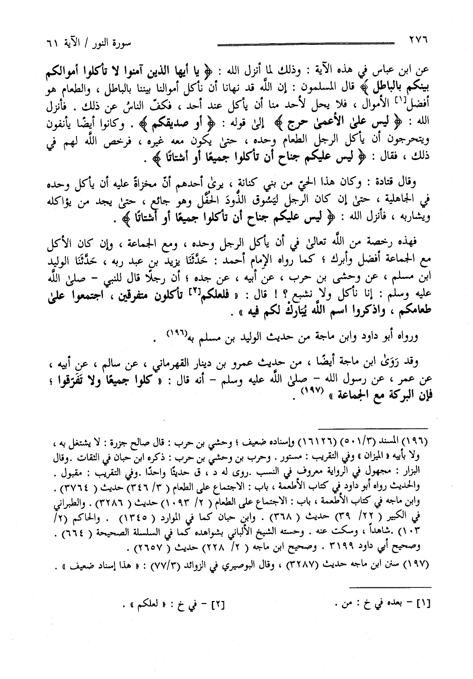 عَنْ اِبْن عَبَّاس فِي هَذِهِ الْآيَة وَذَلِكَ لَمَّا أَنْزَلَ اللَّه " يَا أَيّهَا الَّذِينَ آمَنُوا لَا تَأْكُلُوا أَمْوَالكُمْ بَيْنكُمْ بِالْبَاطِلِ " قَالَ الْمُسْلِمُونَ إِنَّ اللَّه قَدْ نَهَانَا أَنْ نَأْكُل أَمْوَالنَا بَيْننَا بِالْبَاطِلِ وَالطَّعَام مِنْ أَفْضَل الْأَمْوَال فَلَا يَحِلّ لِأَحَدٍ مِنَّا أَنْ يَأْكُل عِنْد أَحَد فَكَفَّ النَّاس عَنْ ذَلِكَ فَأَنْزَلَ اللَّه " لَيْسَ عَلَى الْأَعْمَى حَرَج - إِلَى قَوْله - أَوْ صَدِيقكُمْ " وَكَانُوا أَيْضًا يَأْنَفُونَ وَيَتَحَرَّجُونَ أَنْ يَأْكُل الرَّجُل الطَّعَام وَحْده حَتَّى يَكُون مَعَهُ غَيْره فَرَخَّصَ اللَّه لَهُمْ فِي ذَلِكَ فَقَالَ : " لَيْسَ عَلَيْكُمْ جُنَاح أَنْ تَأْكُلُوا جَمِيعًا أَوْ أَشْتَاتًا " وَقَالَ قَتَادَة : كَانَ هَذَا الْحَيّ مِنْ بَنِي كِنَانَة يَرَى أَحَدهمْ أَنَّ مَخْزَاة عَلَيْهِ أَنْ يَأْكُل وَحْده فِي الْجَاهِلِيَّة حَتَّى إِنْ كَانَ الرَّجُل لَيَسُوق الذَّوْد الْحَفْل وَهُوَ جَائِع حَتَّى يَجِد مَنْ يُؤَاكِلهُ وَيُشَارِبهُ فَأَنْزَلَ اللَّه " لَيْسَ عَلَيْكُمْ جُنَاح أَنْ تَأْكُلُوا جَمِيعًا أَوْ أَشْتَاتًا " فَهَذِهِ رُخْصَة مِنْ اللَّه تَعَالَى فِي أَنْ يَأْكُل الرَّجُل وَحْده وَمَعَ الْجَمَاعَة وَإِنْ كَانَ الْأَكْل مَعَ الْجَمَاعَة أَبْرك وَأَفْضَل كَمَا رَوَاهُ الْإِمَام أَحْمَد حَدَّثَنَا يَزِيد بْن عَبْد رَبّه حَدَّثَنَا الْوَلِيد بْن مُسْلِم عَنْ وَحْشِيّ بْن حَرْب عَنْ أَبِيهِ عَنْ جَدّه أَنَّ رَجُلًا قَالَ لِلنَّبِيِّ صَلَّى اللَّه عَلَيْهِ وَسَلَّمَ إِنَّا نَأْكُل وَلَا نَشْبَع قَالَ : " لَعَلَّكُمْ تَأْكُلُونَ مُتَفَرِّقِينَ اِجْتَمِعُوا عَلَى طَعَامكُمْ وَاذْكُرُوا اِسْم اللَّه يُبَارَك لَكُمْ فِيهِ " وَرَوَاهُ أَبُو دَاوُد وَابْن مَاجَهْ مِنْ حَدِيث الْوَلِيد بْن مُسْلِم بِهِ وَقَدْ رَوَى اِبْن مَاجَهْ أَيْضًا مِنْ حَدِيث عَمْرو بْن دِينَار الْقَهْرَمَانِيّ عَنْ سَالِم عَنْ أَبِيهِ عَنْ عُمَر عَنْ رَسُول اللَّه صَلَّى اللَّه عَلَيْهِ وَسَلَّمَ أَنَّهُ قَالَ : " كُلُوا جَمِيعًا وَلَا تَفَرَّقُوا فَإِنَّ الْبَرَكَة مَعَ الْجَمَاعَة "