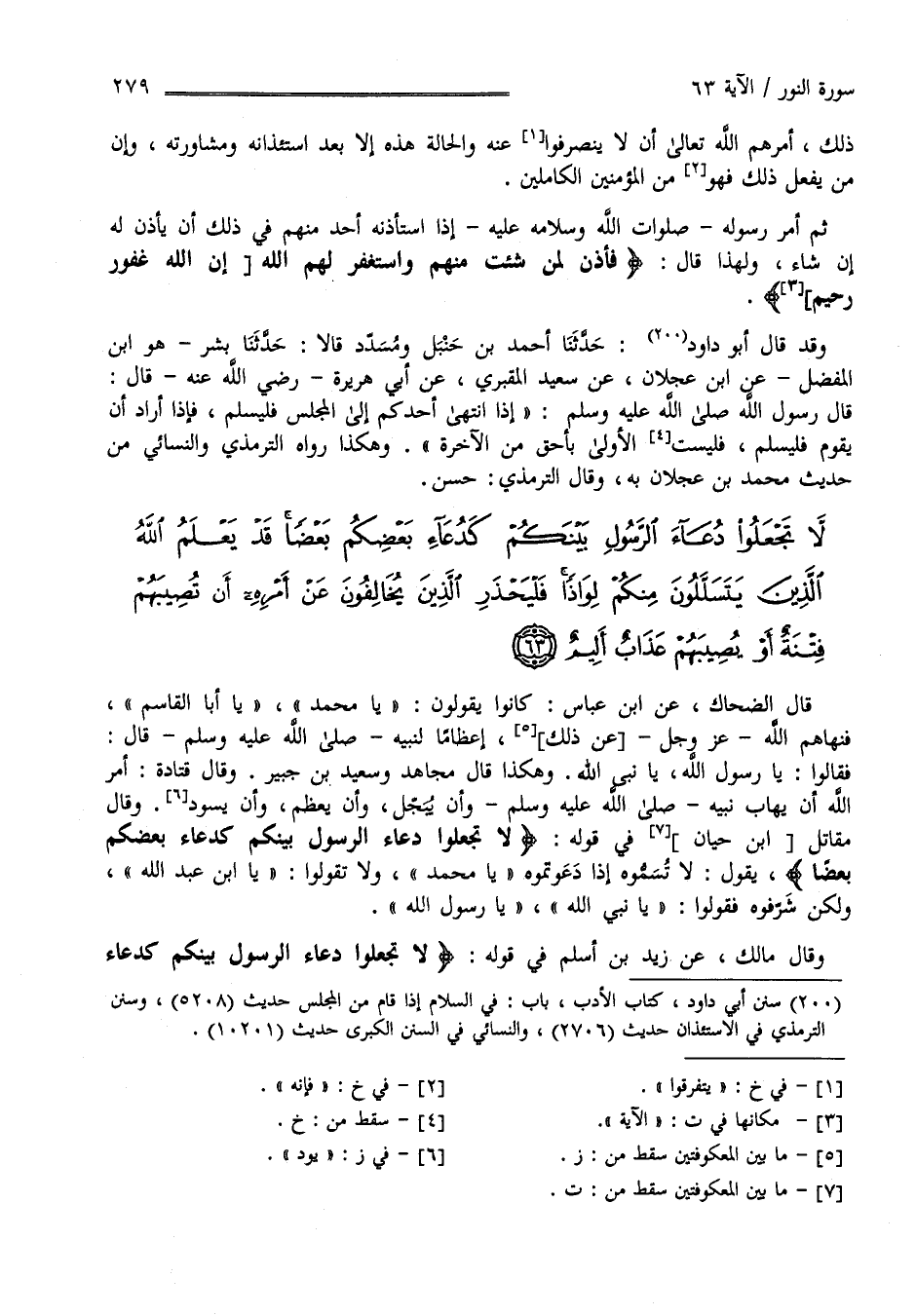 لَا تَجْعَلُوا دُعَاءَ الرَّسُولِ بَيْنَكُمْ كَدُعَاءِ بَعْضِكُمْ بَعْضًا قَدْ يَعْلَمُ اللَّهُ الَّذِينَ يَتَسَلَّلُونَ مِنْكُمْ لِوَاذًا فَلْيَحْذَرِ الَّذِينَ يُخَالِفُونَ عَنْ أَمْرِهِ أَنْ تُصِيبَهُمْ فِتْنَةٌ أَوْ يُصِيبَهُمْ عَذَابٌ أَلِيمٌ