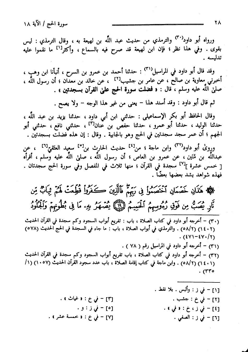 هَذَانِ خَصْمَانِ اخْتَصَمُوا فِي رَبِّهِمْ فَالَّذِينَ كَفَرُوا قُطِّعَتْ لَهُمْ ثِيَابٌ مِنْ نَارٍ يُصَبُّ مِنْ فَوْقِ رُءُوسِهِمُ الْحَمِيمُ