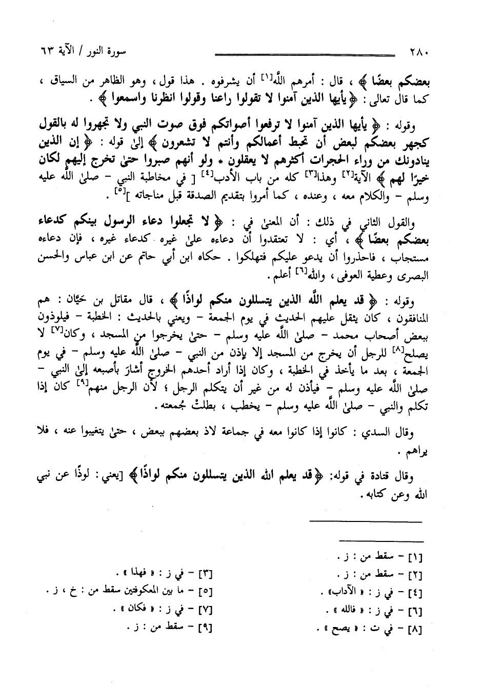بَعْضكُمْ بَعْضًا " قَالَ : أَمَرَهُمْ اللَّه أَنْ يُشَرِّفُوهُ هَذَا قَوْل وَهُوَ الظَّاهِر مِنْ السِّيَاق كَقَوْلِهِ تَعَالَى " يَا أَيّهَا الَّذِينَ آمَنُوا لَا تَقُولُوا رَاعِنَا " إِلَى آخِر الْآيَة وَقَوْله " يَا أَيّهَا الَّذِينَ آمَنُوا لَا تَرْفَعُوا أَصْوَاتكُمْ فَوْق صَوْت النَّبِيّ وَلَا تَجْهَرُوا لَهُ بِالْقَوْلِ كَجَهْرِ بَعْضكُمْ لِبَعْضٍ أَنْ تَحْبَط أَعْمَالكُمْ وَأَنْتُمْ لَا تَشْعُرُونَ - إِلَى قَوْله - إِنَّ الَّذِينَ يُنَادُونَك مِنْ وَرَاء الْحُجُرَات أَكْثَرهمْ لَا يَعْقِلُونَ وَلَوْ أَنَّهُمْ صَبَرُوا حَتَّى تَخْرُج إِلَيْهِمْ لَكَانَ خَيْرًا لَهُمْ " الْآيَة فَهَذَا كُلّه مِنْ بَاب الْأَدَب فِي مُخَاطَبَة النَّبِيّ صَلَّى اللَّه عَلَيْهِ وَسَلَّمَ وَالْكَلَام مَعَهُ وَعِنْده كَمَا أُمِرُوا بِتَقْدِيمِ الصَّدَقَة قَبْل مُنَاجَاته وَالْقَوْل الثَّانِي فِي ذَلِكَ أَنَّ الْمَعْنَى فِي " لَا تَجْعَلُوا دُعَاء الرَّسُول بَيْنكُمْ كَدُعَاءِ بَعْضكُمْ بَعْضًا " أَيْ لَا تَعْتَقِدُوا أَنَّ دُعَاءَهُ عَلَى غَيْره كَدُعَاءِ غَيْره فَإِنَّ دُعَاءَهُ مُسْتَجَاب فَاحْذَرُوا أَنْ يَدْعُو عَلَيْكُمْ فَتَهْلَكُوا حَكَاهُ اِبْن أَبِي حَاتِم عَنْ اِبْن عَبَّاس وَالْحَسَن الْبَصْرِيّ وَعَطِيَّة الْعَوْفِيّ وَاَللَّه أَعْلَم وَقَوْله : " قَدْ يَعْلَم اللَّه الَّذِينَ يَتَسَلَّلُونَ مِنْكُمْ لِوَاذًا " قَالَ مُقَاتِل بْن حَيَّان هُمْ الْمُنَافِقُونَ كَانَ يَثْقُل عَلَيْهِمْ الْحَدِيث فِي يَوْم الْجُمُعَة وَيَعْنِي بِالْحَدِيثِ الْخُطْبَة فَيَلُوذُونَ بِبَعْضِ أَصْحَاب مُحَمَّد صَلَّى اللَّه عَلَيْهِ وَسَلَّمَ حَتَّى يَخْرُجُوا مِنْ الْمَسْجِد وَكَانَ لَا يَصِحّ لِلرَّجُلِ أَنْ يَخْرُج مِنْ الْمَسْجِد إِلَّا بِإِذْنٍ مِنْ النَّبِيّ صَلَّى اللَّه عَلَيْهِ وَسَلَّمَ فِي يَوْم الْجُمُعَة بَعْدَمَا يَأْخُذ فِي الْخُطْبَة وَكَانَ إِذَا أَرَادَ أَحَدهمْ الْخُرُوج أَشَارَ بِأُصْبُعِهِ إِلَى النَّبِيّ صَلَّى اللَّه عَلَيْهِ وَسَلَّمَ فَيَأْذَن لَهُ مِنْ غَيْر أَنْ يَتَكَلَّم الرَّجُل لِأَنَّ الرَّجُل مِنْهُمْ كَانَ إِذَا تَكَلَّمَ وَالنَّبِيّ صَلَّى اللَّه عَلَيْهِ وَسَلَّمَ يَخْطُب بَطَلَتْ جُمُعَته وَقَالَ السُّدِّيّ : كَانُوا إِذَا كَانُوا مَعَهُ فِي جَمَاعَة لَاذَ بَعْضهمْ بِبَعْضٍ حَتَّى يَتَغَيَّبُوا عَنْهُ فَلَا يَرَاهُمْ وَقَالَ قَتَادَة فِي قَوْله " قَدْ يَعْلَم اللَّه الَّذِينَ يَتَسَلَّلُونَ مِنْكُمْ لِوَاذًا " يَعْنِي لِوَاذًا عَنْ نَبِيّ اللَّه وَعَنْ كِتَابه