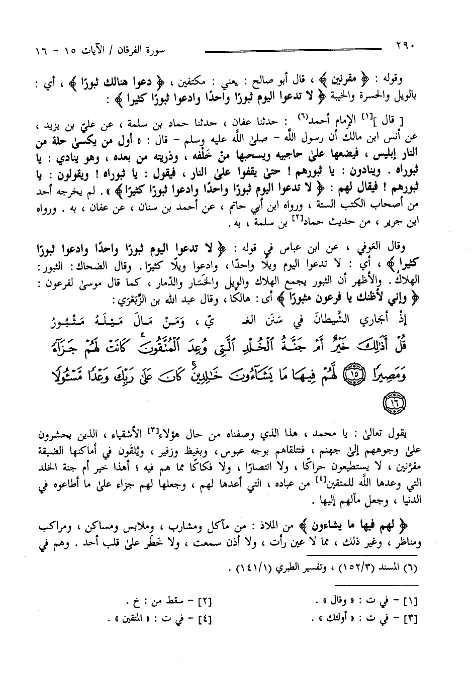 " لَا تَدْعُوا الْيَوْم ثُبُورًا وَاحِدًا " الْآيَة رَوَى الْإِمَام أَحْمَد حَدَّثَنَا عَفَّان حَدَّثَنَا حَمَّاد بْن سَلَمَة عَنْ عَلِيّ بْن يَزِيد عَنْ أَنَس بْن مَالِك أَنَّ رَسُول اللَّه صَلَّى اللَّه عَلَيْهِ وَسَلَّمَ قَالَ " أَوَّل مَنْ يُكْسَى حُلَّة مِنْ النَّار إِبْلِيس فَيَضَعهَا عَلَى حَاجِبَيْهِ وَيَسْحَبهَا مِنْ خَلْفه وَذُرِّيَّته مِنْ بَعْده وَهُوَ يُنَادِي يَا ثُبُورَاه وَيُنَادُونَ يَا ثُبُورهمْ حَتَّى يَقِفُوا عَلَى النَّار فَيَقُول يَا ثُبُورَاه وَيَقُولُونَ يَا ثُبُورهمْ فَيُقَال لَهُمْ " لَا تَدْعُوا الْيَوْم ثُبُورًا وَاحِدًا وَادْعُوا ثُبُورًا كَثِيرًا " لَمْ يُخَرِّجهُ أَحَد مِنْ أَصْحَاب الْكُتُب السِّتَّة وَرَوَاهُ اِبْن أَبِي حَاتِم عَنْ أَحْمَد بْن سِنَان عَنْ عَفَّان بِهِ وَرَوَاهُ اِبْن جَرِير مِنْ حَدِيث حَمَّاد بْن سَلَمَة بِهِ وَقَالَ الْعَوْفِيّ عَنْ اِبْن عَبَّاس فِي قَوْله " لَا تَدْعُوا الْيَوْم ثُبُورًا وَاحِدًا " الْآيَة أَيْ لَا تَدْعُوا الْيَوْم وَيْلًا وَاحِدًا وَادْعُوا وَيْلًا كَثِيرًا وَقَالَ الضَّحَّاك الثُّبُور الْهَلَاك وَالْأَظْهَر أَنَّ الثُّبُور يَجْمَع الْهَلَاك وَالْوَيْل وَالْخَسَار وَالدَّمَار كَمَا قَالَ مُوسَى لِفِرْعَوْن " وَإِنِّي لَأَظُنّك يَا فِرْعَوْن مَثْبُورًا " أَيْ هَالِكًا قَالَ عُبَيْد اللَّه بْن الزِّبَعْرَى :