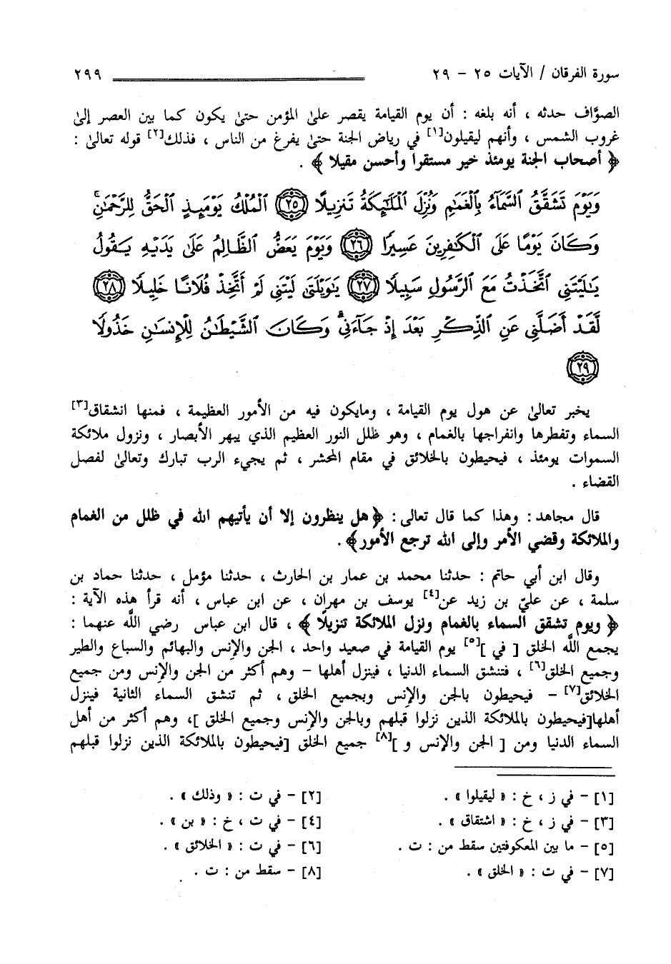 قَالَ مُجَاهِد وَهَذَا كَمَا قَالَ تَعَالَى : " هَلْ يَنْظُرُونَ إِلَّا أَنْ يَأْتِيهِمْ اللَّه فِي ظُلَل مِنْ الْغَمَام وَالْمَلَائِكَة " الْآيَة قَالَ اِبْن أَبِي حَاتِم حَدَّثَنَا مُحَمَّد بْن عَمَّار بْن الْحَارِث حَدَّثَنَا مُؤَمَّل حَدَّثَنَا حَمَّاد بْن سَلَمَة عَنْ عَلِيّ بْن زَيْد عَنْ يُوسُف بْن مِهْرَان عَنْ اِبْن عَبَّاس أَنَّهُ قَرَأَ هَذِهِ الْآيَة " وَيَوْم تَشَقَّقُ السَّمَاء بِالْغَمَامِ وَنُزِّلَ الْمَلَائِكَة تَنْزِيلًا" قَالَ اِبْن عَبَّاس رَضِيَ اللَّه عَنْهُمَا يَجْمَع اللَّه تَعَالَى الْخَلْق يَوْم الْقِيَامَة فِي صَعِيد وَاحِد الْجِنّ وَالْإِنْس وَالْبَهَائِم وَالسِّبَاع وَالطَّيْر وَجَمِيع الْخَلْق فَتَنْشَقّ السَّمَاء الدُّنْيَا فَيَنْزِل أَهْلهَا وَهُمْ أَكْثَر مِنْ الْجِنّ وَالْإِنْس وَمِنْ جَمِيع الْخَلْق فَيُحِيطُونَ بِالْجِنِّ وَالْإِنْس وَبِجَمِيعِ الْخَلْق ثُمَّ تَنْشَقّ السَّمَاء الثَّانِيَة فَيَنْزِل أَهْلهَا فَيُحِيطُونَ بِالْمَلَائِكَةِ الَّذِينَ نَزَلُوا قَبْلهمْ