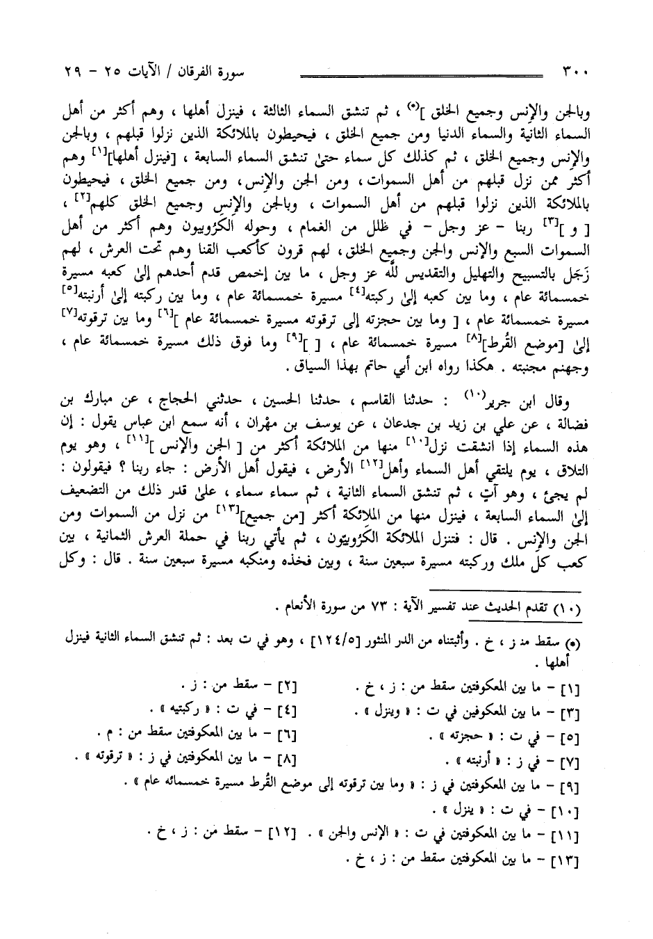 وَبِالْجِنِّ وَالْإِنْس وَجَمِيع الْخَلْق وَهُمْ أَكْثَر مِنْ أَهْل السَّمَاء الدُّنْيَا وَمِنْ جَمِيع الْخَلْق ثُمَّ تَنْشَقّ السَّمَاء الثَّالِثَة فَيَنْزِل أَهْلهَا وَهُمْ أَكْثَر مِنْ أَهْل السَّمَاء الثَّانِيَة وَالسَّمَاء الدُّنْيَا وَمِنْ جَمِيع الْخَلْق فَيُحِيطُونَ بِالْمَلَائِكَةِ الَّذِينَ نَزَلُوا قَبْلهمْ وَبِالْجِنِّ وَالْإِنْس وَجَمِيع الْخَلْق ثُمَّ كَذَلِكَ كُلّ سَمَاء عَلَى ذَلِكَ التَّضْعِيف حَتَّى تَنْشَقّ السَّمَاء السَّابِعَة فَيَنْزِل أَهْلهَا وَهُمْ أَكْثَر مِمَّنْ نَزَلَ قَبْلهمْ مِنْ أَهْل السَّمَوَات وَمِنْ الْجِنّ وَالْإِنْس وَمِنْ جَمِيع الْخَلْق فَيُحِيطُونَ بِالْمَلَائِكَةِ الَّذِينَ نَزَلُوا قَبْلهمْ مِنْ أَهْل السَّمَوَات وَبِالْجِنِّ وَالْإِنْس وَجَمِيع الْخَلْق كُلّهمْ وَيَنْزِل رَبّنَا عَزَّ وَجَلَّ فِي ظُلَل مِنْ الْغَمَام وَحَوْله الْكَرُوبِيُّونَ وَهُمْ أَكْثَر مِنْ أَهْل السَّمَوَات السَّبْع وَمِنْ الْجِنّ وَالْإِنْس وَجَمِيع الْخَلْق لَهُمْ قُرُون كَأَكْعُب الْقَنَا وَهُمْ تَحْت الْعَرْش لَهُمْ زَجَل بِالتَّسْبِيحِ وَالتَّهْلِيل وَالتَّقْدِيس لِلَّهِ عَزَّ وَجَلَّ مَا بَيْن أَخْمَص قَدَم أَحَدهمْ إِلَى كَعْبه مَسِيرَة خَمْسمِائَةِ عَام وَمَا بَيْن كَعْبه إِلَى رُكْبَتَيْهِ مَسِيرَة خَمْسمِائَةِ عَام مَا بَيْن رُكْبَته إِلَى حُجْزَته مَسِيرَة خَمْسمِائَةِ عَام وَمَا بَيْن حُجْزَته إِلَى تَرْقُوَته مَسِيرَة خَمْسمِائَةِ عَام وَمَا بَيْن تَرْقُوَته إِلَى مَوْضِع الْقُرْط مَسِيرَة خَمْسمِائَةِ عَام وَمَا فَوْق ذَلِكَ مَسِيرَة خَمْسمِائَةِ عَام وَجَهَنَّم مُحِسَّة هَكَذَا رَوَاهُ اِبْن أَبِي حَاتِم بِهَذَا السِّيَاق وَقَالَ اِبْن جَرِير حَدَّثَنَا الْقَاسِم حَدَّثَنَا الْحُسَيْن حَدَّثَنِي الْحَجَّاج عَنْ مُبَارَك بْن فَضَالَة عَنْ عَلِيّ بْن زَيْد بْن جُدْعَان عَنْ يُوسُف بْن مِهْرَان أَنَّهُ سَمِعَ اِبْن عَبَّاس يَقُول : إِنَّ هَذِهِ السَّمَاء إِذَا اِنْشَقَّتْ يَنْزِل مِنْهَا مِنْ الْمَلَائِكَة أَكْثَر مِنْ الْإِنْس وَالْجِنّ وَهُوَ يَوْم التَّلَاق يَوْم يَلْتَقِي أَهْل السَّمَاء وَأَهْل الْأَرْض فَيَقُول أَهْل الْأَرْض جَاءَ رَبّنَا ؟ فَيَقُولُونَ لَمْ يَجِئْ وَهُوَ آتٍ ثُمَّ تَنْشَقّ السَّمَاء الثَّانِيَة ثُمَّ سَمَاء سَمَاء عَلَى قَدْر ذَلِكَ مِنْ التَّضْعِيف إِلَى السَّمَاء السَّابِعَة فَيَنْزِل مِنْهَا
