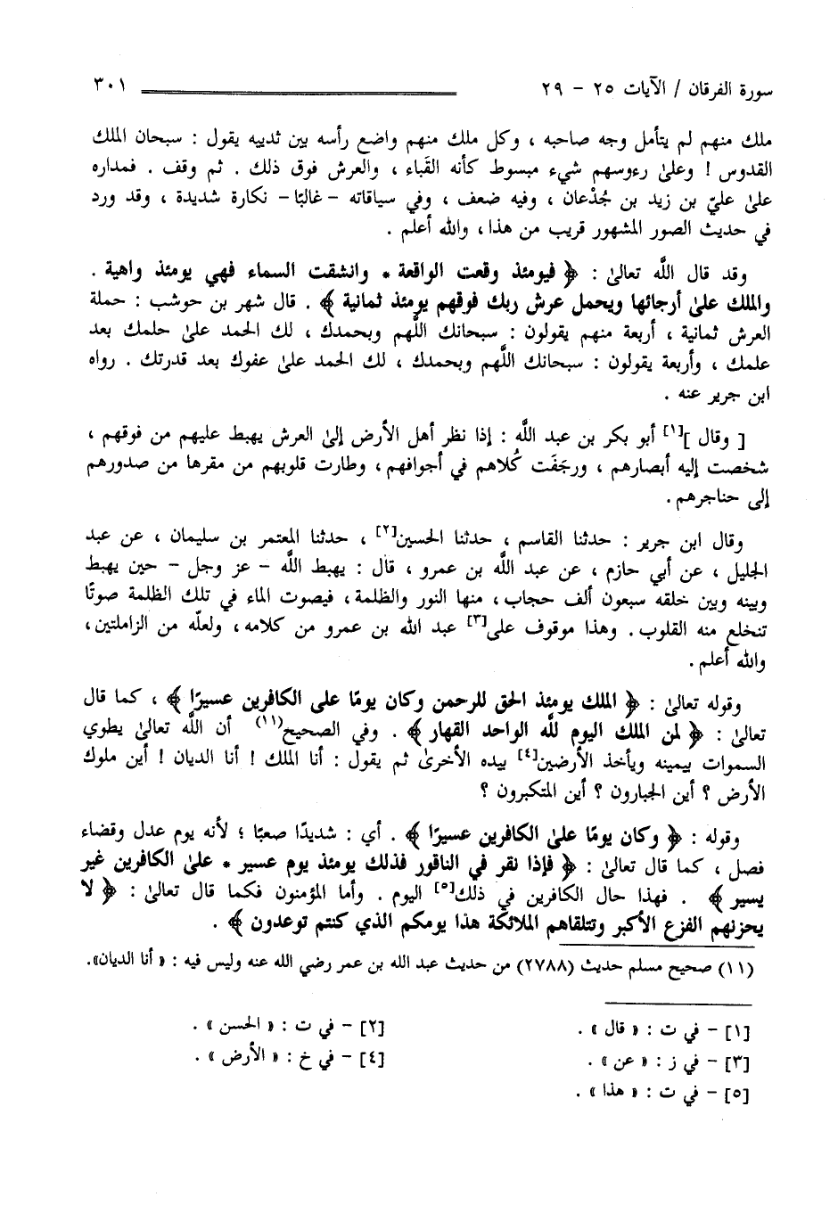 وَقَوْله تَعَالَى : " الْمُلْك يَوْمئِذٍ الْحَقّ لِلرَّحْمَنِ" الْآيَة كَمَا قَالَ تَعَالَى : " لِمَنْ الْمُلْك الْيَوْم لِلَّهِ الْوَاحِد الْقَهَّار " وَفِي الصَّحِيح أَنَّ اللَّه تَعَالَى يَطْوِي السَّمَوَات بِيَمِينِهِ وَيَأْخُذ الْأَرْضِينَ بِيَدِهِ الْأُخْرَى ثُمَّ يَقُول : أَنَا الْمَلِك أَنَا الدَّيَّان أَيْنَ مُلُوك الْأَرْض ؟ أَيْنَ الْجَبَّارُونَ ؟ أَيْنَ الْمُتَكَبِّرُونَ ؟ وَقَوْله : " وَكَانَ يَوْمًا عَلَى الْكَافِرِينَ عَسِيرًا " أَيْ شَدِيدًا صَعْبًا لِأَنَّهُ يَوْم عَدْل وَقَضَاء فَصْل كَمَا قَالَ تَعَالَى : " فَذَلِكَ يَوْمئِذٍ يَوْم عَسِير عَلَى الْكَافِرِينَ غَيْر يَسِير " فَهَذَا حَال الْكَافِرِينَ فِي هَذَا الْيَوْم وَأَمَّا الْمُؤْمِنُونَ فَكَمَا قَالَ تَعَالَى : " لَا يَحْزُنهُمْ الْفَزَع الْأَكْبَر " الْآيَة .