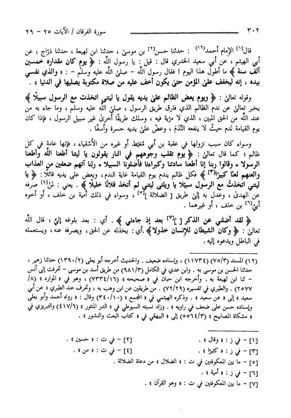وَيَعَضّ عَلَى يَدَيْهِ قَائِلًا : " يَا لَيْتَنِي اِتَّخَذْت مَعَ الرَّسُول سَبِيلًا يَا وَيْلَتَا لَيْتَنِي لَمْ أَتَّخِذ فُلَانًا خَلِيلًا " يَعْنِي مَنْ صَرَفَهُ عَنْ الْهُدَى وَعَدَلَ بِهِ إِلَى طَرِيق الضَّلَال مِنْ دُعَاة الضَّلَالَة وَسَوَاء فِي ذَلِكَ أُمَيَّة بْن خَلَف أَوْ أَخُوهُ أُبَيّ بْن خَلَف أَوْ غَيْرهمَا .