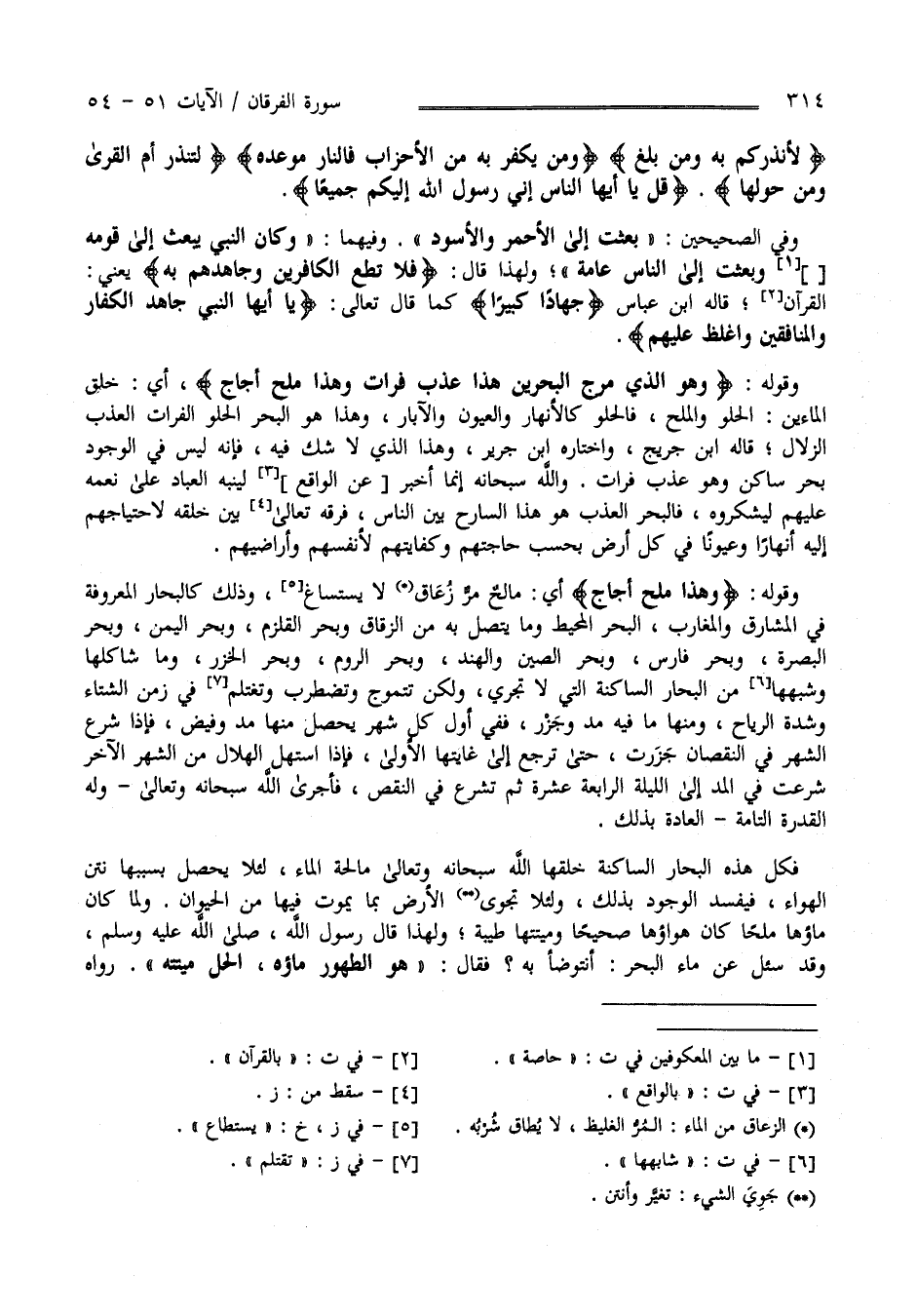 وَقَوْله تَعَالَى " وَهُوَ الَّذِي مَرَجَ الْبَحْرَيْنِ هَذَا عَذْب فُرَات وَهَذَا مِلْح أُجَاج " أَيْ خَلَقَ الْمَاءَيْنِ الْحُلْو وَالْمِلْح فَالْحُلْو كَالْأَنْهَارِ وَالْعُيُون وَالْآبَار وَهَذَا هُوَ الْبَحْر الْحُلْو الْعَذْب الْفُرَات الزُّلَال قَالَهُ اِبْن جُرَيْج وَاخْتَارَهُ اِبْن جَرِير وَهَذَا الْمَعْنَى لَا شَكّ فِيهِ فَإِنَّهُ لَيْسَ فِي الْوُجُود بَحْر سَاكِن وَهُوَ عَذْب فُرَات ; وَاَللَّه سُبْحَانه وَتَعَالَى إِنَّمَا أَخْبَرَ بِالْوَاقِعِ لِيُنَبِّه الْعِبَاد عَلَى نِعْمَة عَلَيْهِمْ لِيَشْكُرُوهُ فَالْبَحْر الْعَذْب هُوَ هَذَا السَّارِح بَيْن النَّاس فَرَّقَهُ اللَّه تَعَالَى بَيْن خَلْقه لِاحْتِيَاجِهِمْ إِلَيْهِ أَنْهَارًا وَعُيُونًا فِي كُلّ أَرْض بِحَسَبِ حَاجَتهمْ وَكِفَايَتهمْ لِأَنْفُسِهِمْ وَأَرَاضِيهمْ وَقَوْله تَعَالَى : " وَهَذَا مِلْح أُجَاج" أَيْ مَالِح مُرّ زُعَاق لَا يُسْتَسَاغ وَذَلِكَ كَالْبِحَارِ الْمَعْرُوفَة فِي الْمَشَارِق وَالْمَغَارِب : الْبَحْر الْمُحِيط وَمَا يَتَّصِل بِهِ مِنْ الزُّقَاق وَبَحْر الْقُلْزُم وَبَحْر الْيَمَن وَبَحْر الْبَصْرَة وَبَحْر فَارِس وَبَحْر الصِّين وَالْهِنْد وَبَحْر الرُّوم وَبَحْر الْخَزَر وَمَا شَاكَلَهَا وَشَابَهَهَا مِنْ الْبِحَار السَّاكِنَة الَّتِي لَا تَجْرِي وَلَكِنْ تَمُوج وَتَضْطَرِب وَتَلْتَطِم فِي زَمَن الشِّتَاء وَشِدَّة الرِّيَاح وَمِنْهَا مَا فِيهِ مَدّ وَجَزْر فَفِي أَوَّل كُلّ شَهْر يَحْصُل مِنْهَا مَدّ وَفَيْض فَإِذَا شَرَعَ الشَّهْر فِي النُّقْصَان جَزَرَتْ حَتَّى تَرْجِع إِلَى غَايَتهَا الْأُولَى فَإِذَا اِسْتَهَلَّ الْهِلَال مِنْ الشَّهْر الْآخَر شَرَعَتْ فِي الْمَدّ إِلَى اللَّيْلَة الرَّابِعَة عَشْرَة ثُمَّ تَشْرَع فِي النَّقْص فَأَجْرَى اللَّه سُبْحَانه وَتَعَالَى - وَهُوَ ذُو الْقُدْرَة التَّامَّة - الْعَادَة بِذَلِكَ فَكُلّ هَذِهِ الْبِحَار السَّاكِنَة خَلَقَهَا اللَّه سُبْحَانه وَتَعَالَى مَالِحَة لِئَلَّا يَحْصُل بِسَبَبِهَا نَتْن الْهَوَاء فَيَفْسُد الْوُجُود بِذَلِكَ وَلِئَلَّا تَجْوَى الْأَرْض بِمَا يَمُوت فِيهَا مِنْ الْحَيَوَان وَلَمَّا كَانَ مَاؤُهَا مِلْحًا كَانَ هَوَاؤُهَا صَحِيحًا وَمَيْتَتهَا طَيِّبَة وَلِهَذَا قَالَ رَسُول اللَّه صَلَّى اللَّه عَلَيْهِ وَسَلَّمَ وَقَدْ سُئِلَ عَنْ مَاء الْبَحْر أَنَتَوَضَّأُ بِهِ ؟ فَقَالَ : " هُوَ الطَّهُور مَاؤُهُ الْحِلّ مَيْتَته " رَوَاهُ