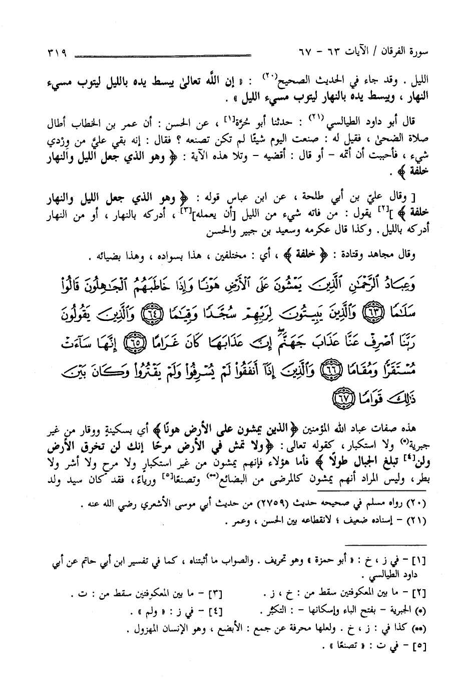 هَذِهِ صِفَات عِبَاد اللَّه الْمُؤْمِنِينَ " الَّذِينَ يَمْشُونَ عَلَى الْأَرْض هَوْنًا" أَيْ بِسَكِينَةٍ وَوَقَار مِنْ غَيْر جَبْرِيَّة وَلَا اِسْتِكْبَار كَقَوْلِهِ تَعَالَى " وَلَا تَمْشِ فِي الْأَرْض مَرَحًا " الْآيَة فَأَمَّا هَؤُلَاءِ فَإِنَّهُمْ يَمْشُونَ مِنْ غَيْر اِسْتِكْبَار وَلَا مَرَح وَلَا أَشَر وَلَا بَطَر وَلَيْسَ الْمُرَاد أَنَّهُمْ يَمْشُونَ كَالْمَرْضَى تَصَنُّعًا وَرِيَاء فَقَدْ كَانَ سَيِّد وَلَد