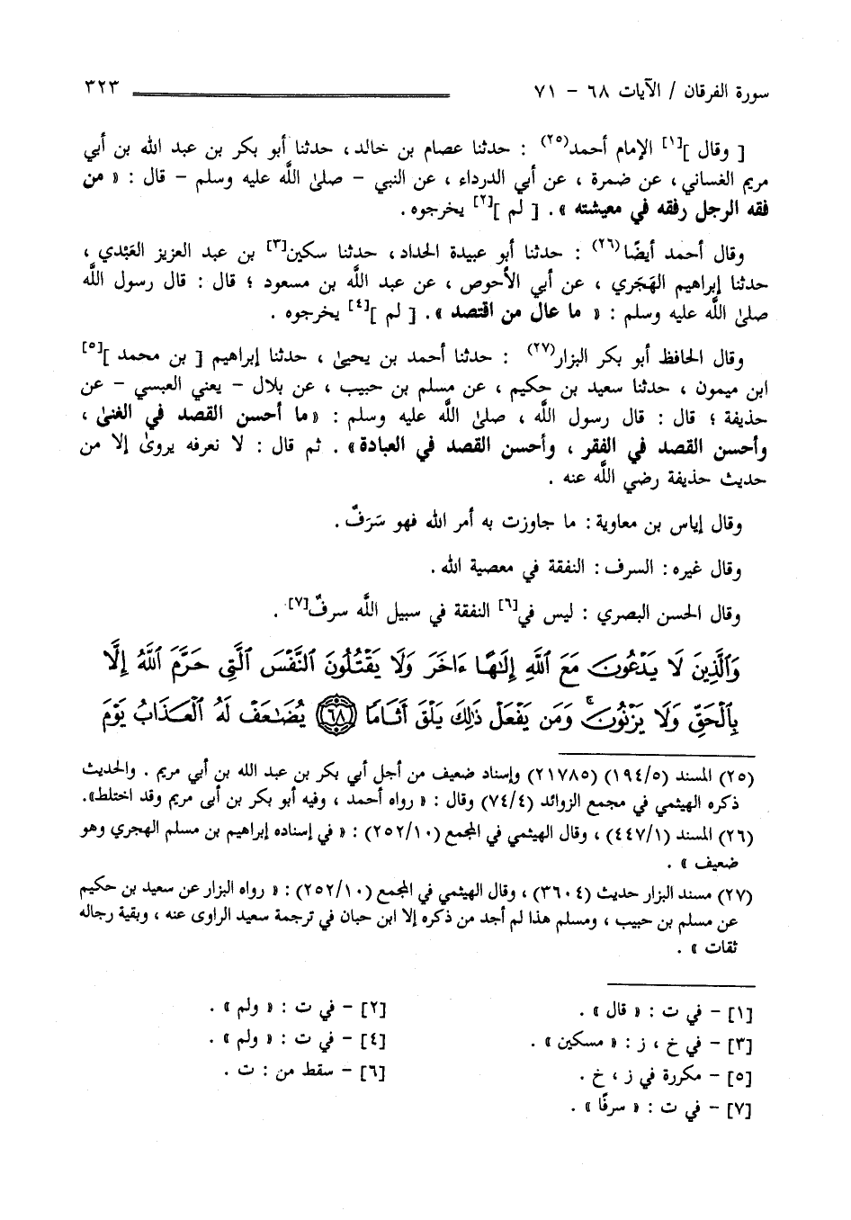 " الْآيَة وَقَالَ الْإِمَام أَحْمَد حَدَّثَنَا عِصَام بْن خَالِد حَدَّثَنِي أَبُو بَكْر بْن عَبْد اللَّه بْن أَبِي تَمِيم الْغَسَّانِيّ عَنْ ضَمْرَة عَنْ أَبِي الدَّرْدَاء عَنْ النَّبِيّ صَلَّى اللَّه عَلَيْهِ وَسَلَّمَ قَالَ " مِنْ فِقْه الرَّجُل قَصْده فِي مَعِيشَته " وَلَمْ يُخَرِّجُوهُ وَقَالَ الْإِمَام أَحْمَد أَيْضًا حَدَّثَنَا أَبُو عُبَيْدَة الْحَدَّاد حَدَّثَنَا مِسْكِين بْن عَبْد الْعَزِيز الْعَبْدِيّ حَدَّثَنَا إِبْرَاهِيم الْهَجَرِيّ عَنْ أَبِي الْأَحْوَص عَنْ عَبْد اللَّه بْن مَسْعُود قَالَ : قَالَ رَسُول اللَّه صَلَّى اللَّه عَلَيْهِ وَسَلَّمَ" مَا عَالَ مَنْ اِقْتَصَدَ " لَمْ يُخَرِّجُوهُ وَقَالَ الْحَافِظ أَبُو بَكْر الْبَزَّار حَدَّثَنَا أَحْمَد بْن يَحْيَى حَدَّثَنَا إِبْرَاهِيم بْن مُحَمَّد بْن مَيْمُون حَدَّثَنَا سَعْد بْن حَكِيم عَنْ مُسْلِم بْن حَبِيب عَنْ بِلَال يَعْنِي الْعَبْسِيّ - عَنْ حُذَيْفَة قَالَ : قَالَ رَسُول اللَّه صَلَّى اللَّه عَلَيْهِ وَسَلَّمَ " مَا أَحْسَن الْقَصْد فِي الْغِنَى وَمَا أَحْسَن الْقَصْد فِي الْفَقْر وَمَا أَحْسَن الْقَصْد فِي الْعِبَادَة " ثُمَّ قَالَ لَا نَعْرِفهُ يُرْوَى إِلَّا مِنْ حَدِيث حُذَيْفَة رَضِيَ اللَّه عَنْهُ وَقَالَ الْحَسَن الْبَصْرِيّ لَيْسَ فِي النَّفَقَة فِي سَبِيل اللَّه سَرَف وَقَالَ إِيَاس بْن مُعَاوِيَة : مَا جَاوَزْت بِهِ أَمْر اللَّه تَعَالَى فَهُوَ سَرَف وَقَالَ غَيْره السَّرَف النَّفَقَة فِي مَعْصِيَة اللَّه عَزَّ وَجَلَّ .