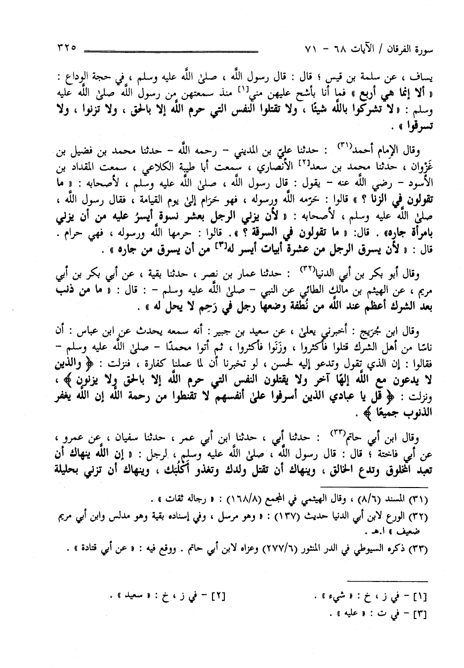 الدُّنْيَا حَدَّثَنَا عَمَّار بْن نَصْر حَدَّثَنَا بَقِيَّة عَنْ أَبِي بَكْر بْن أَبِي مَرْيَم عَنْ الْهَيْثَم بْن مَالِك الطَّائِيّ عَنْ النَّبِيّ صَلَّى اللَّه عَلَيْهِ وَسَلَّمَ قَالَ " مَا مِنْ ذَنْب بَعْد الشِّرْك أَعْظَم عِنْد اللَّه مِنْ نُطْفَة وَضَعَهَا رَجُل فِي رَحِم لَا يَحِلّ لَهُ " وَقَالَ اِبْن جُرَيْج أَخْبَرَنِي يَعْلَى عَنْ سَعِيد بْن جُبَيْر أَنَّهُ سَمِعَ اِبْن عَبَّاس يُحَدِّث أَنَّ نَاسًا مِنْ أَهْل الشِّرْك قَتَلُوا فَأَكْثَرُوا وَزَنَوْا فَأَكْثَرُوا ثُمَّ أَتَوْا مُحَمَّدًا صَلَّى اللَّه عَلَيْهِ وَسَلَّمَ فَقَالُوا إِنَّ الَّذِي تَقُول وَتَدْعُو إِلَيْهِ لَحَسَن لَوْ تُخْبِرنَا أَنَّ لِمَا عَمِلْنَا كَفَّارَة فَنَزَلَتْ " وَاَلَّذِينَ لَا يَدْعُونَ مَعَ اللَّه إِلَهًا آخَر " الْآيَة وَنَزَلَتْ " قُلْ يَا عِبَادِيَ الَّذِينَ أَسْرَفُوا عَلَى أَنْفُسهمْ " الْآيَة وَقَالَ اِبْن أَبِي حَاتِم حَدَّثَنَا أَبِي حَدَّثَنَا اِبْن أَبِي عُمَر حَدَّثَنَا سُفْيَان عَنْ عَمْرو عَنْ أَبِي فَاخِتَة قَالَ : قَالَ رَسُول اللَّه صَلَّى اللَّه عَلَيْهِ وَسَلَّمَ لِرَجُلٍ " إِنَّ اللَّه يَنْهَاك أَنْ تَعْبُد الْمَخْلُوق وَتَدَع الْخَالِق وَيَنْهَاك أَنْ تَقْتُل وَلَدك وَتَغْذُو كَلْبك وَيَنْهَاك أَنْ تَزْنِيَ بِحَلِيلَةِ