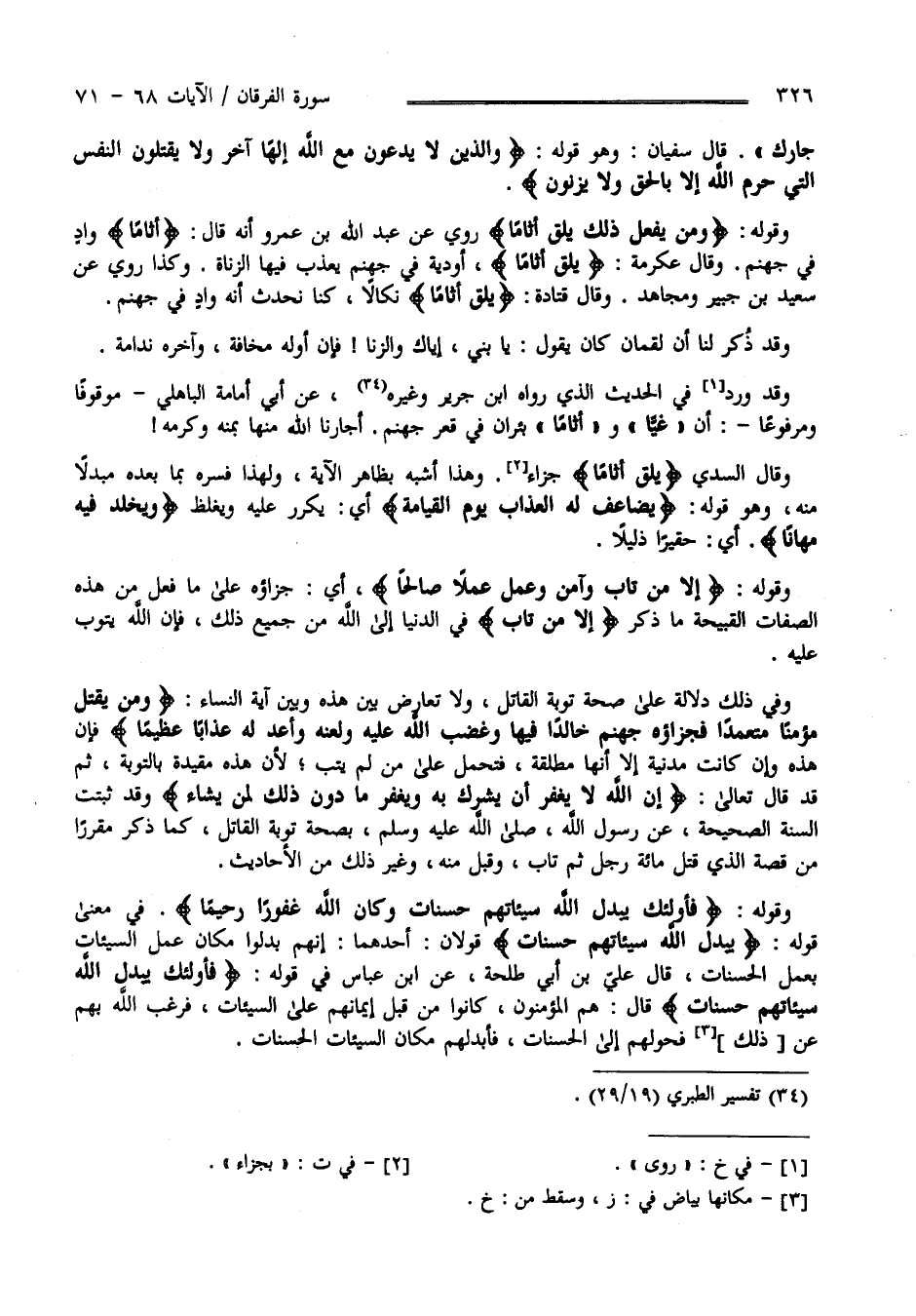 وَقَوْله تَعَالَى " إِلَّا مَنْ تَابَ وَآمَنَ وَعَمِلَ عَمَلًا صَالِحًا" أَيْ جَزَاؤُهُ عَلَى مَا فَعَلَ مِنْ هَذِهِ الصِّفَات الْقَبِيحَة مَا ذُكِرَ " إِلَّا مَنْ تَابَ " أَيْ فِي الدُّنْيَا إِلَى اللَّه عَزَّ وَجَلَّ مِنْ جَمِيع ذَلِكَ فَإِنَّ اللَّه يَتُوب عَلَيْهِ وَفِي ذَلِكَ دَلَالَة عَلَى صِحَّة تَوْبَة الْقَاتِل وَلَا تَعَارُض بَيْن هَذِهِ وَبَيْن آيَة النِّسَاء " وَمَنْ يَقْتُل مُؤْمِنًا مُتَعَمِّدًا" الْآيَة فَإِنَّ هَذِهِ وَإِنْ كَانَتْ مَدَنِيَّة إِلَّا أَنَّهَا مُطْلَقَة فَتُحْمَل عَلَى مَنْ لَمْ يَتُبْ لِأَنَّ هَذِهِ مُقَيَّدَة بِالتَّوْبَةِ ثُمَّ قَدْ قَالَ تَعَالَى " إِنَّ اللَّه لَا يَغْفِر أَنْ يُشْرَك بِهِ " الْآيَة قَدْ ثَبَتَتْ السُّنَّة الصَّحِيحَة عَنْ رَسُول اللَّه صَلَّى اللَّه عَلَيْهِ وَسَلَّمَ بِصِحَّةِ تَوْبَة الْقَاتِل كَمَا ذُكِرَ مُقَرَّرًا مِنْ قِصَّة الَّذِي قَتَلَ مِائَة رَجُل ثُمَّ تَابَ فَقَبِلَ اللَّه تَوْبَته وَغَيْر ذَلِكَ مِنْ الْأَحَادِيث وَقَوْله تَعَالَى " فَأُولَئِكَ يُبَدِّل اللَّه سَيِّئَاتهمْ حَسَنَات وَكَانَ اللَّه غَفُورًا رَحِيمًا " فِي مَعْنَى قَوْله " يُبَدِّل اللَّه سَيِّئَاتهمْ حَسَنَات " قَوْلَانِ أَحَدهمَا أَنَّهُمْ بُدِّلُوا مَكَان عَمَل السَّيِّئَات بِعَمَلِ الْحَسَنَات قَالَ عَلِيّ بْن أَبِي طَلْحَة عَنْ اِبْن عَبَّاس فِي الْآيَة قَالَ هُمْ الْمُؤْمِنُونَ كَانُوا مِنْ قَبْل إِيمَانهمْ عَلَى السَّيِّئَات فَرَغِبَ اللَّه بِهِمْ عَنْ السَّيِّئَات فَحَوَّلَهُمْ إِلَى الْحَسَنَات فَأَبْدَلَهُمْ مَكَان السَّيِّئَات الْحَسَنَات
