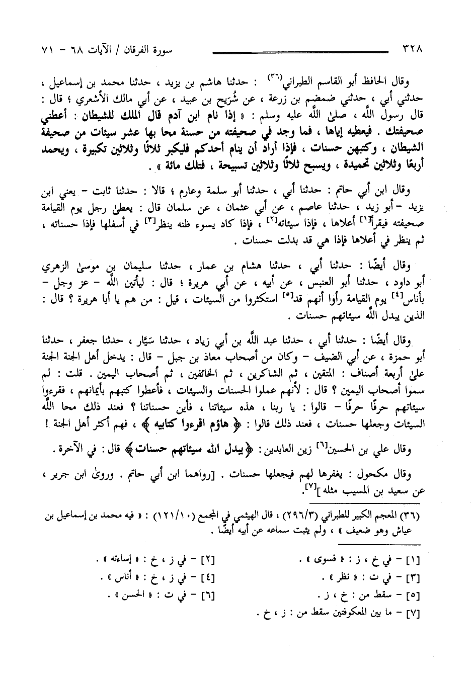 وَقَالَ الْحَافِظ أَبُو الْقَاسِم الطَّبَرَانِيّ حَدَّثَنَا هَاشِم بْن يَزِيد حَدَّثَنَا مُحَمَّد بْن إِسْمَاعِيل حَدَّثَنِي أَبِي حَدَّثَنِي ضَمْضَم بْن زُرْعَة عَنْ شُرَيْح بْن عُبَيْد عَنْ أَبِي مَالِك الْأَشْعَرِيّ قَالَ : قَالَ رَسُول اللَّه صَلَّى اللَّه عَلَيْهِ وَسَلَّمَ " إِذَا نَامَ اِبْن آدَم قَالَ الْمَلَك لِلشَّيْطَانِ أَعْطِنِي صَحِيفَتَك فَيُعْطِيه إِيَّاهَا فَمَا وَجَدَ فِي صَحِيفَةٍ مِنْ حَسَنَةٍ مَحَا بِهَا عَشْر سَيِّئَات مِنْ صَحِيفَة الشَّيْطَان وَكَتَبَهُنَّ حَسَنَات فَإِذَا أَرَادَ أَحَدكُمْ أَنْ يَنَام فَلْيُكَبِّرْ ثَلَاثًا وَثَلَاثِينَ تَكْبِيرَة وَيَحْمَد أَرْبَعًا وَثَلَاثِينَ تَحْمِيدَة وَيُسَبِّح ثَلَاثًا وَثَلَاثِينَ تَسْبِيحَة فَتِلْكَ مِائَة " وَقَالَ اِبْن أَبِي حَاتِم حَدَّثَنَا أَبِي حَدَّثَنَا أَبُو سَلَمَة وَعَارِم قَالَا حَدَّثَنَا ثَابِت يَعْنِي اِبْن يَزِيد أَبُو زَيْد حَدَّثَنَا عَاصِم عَنْ أَبِي عُثْمَان عَنْ سَلْمَان قَالَ يُعْطَى الرَّجُل يَوْم الْقِيَامَة صَحِيفَته فَيَقْرَأ أَعْلَاهَا فَإِذَا سَيِّئَاته فَإِذَا كَادَ يَسُوء ظَنّه نَظَرَ فِي أَسْفَلهَا فَإِذَا حَسَنَاته ثُمَّ يَنْظُر فِي أَعْلَاهَا فَإِذَا هِيَ قَدْ بُدِّلَتْ حَسَنَات وَقَالَ أَيْضًا حَدَّثَنَا أَبِي حَدَّثَنَا هِشَام بْن عَمَّار حَدَّثَنَا سَلْمَان بْن مُوسَى