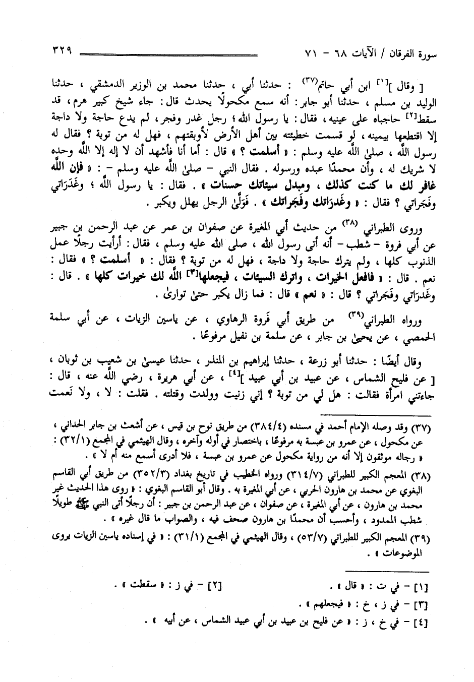 قَالَ اِبْن أَبِي حَاتِم حَدَّثَنَا أَبِي حَدَّثَنَا مُحَمَّد بْن الْوَزِير الدِّمَشْقِيّ حَدَّثَنَا الْوَلِيد بْن مُسْلِم حَدَّثَنَا أَبُو جَابِر أَنَّهُ سَمِعَ مَكْحُولًا يُحَدِّث قَالَ : جَاءَ شَيْخ كَبِير هَرِم قَدْ سَقَطَ حَاجِبَاهُ عَلَى عَيْنَيْهِ فَقَالَ يَا رَسُول اللَّه رَجُل غَدَرَ وَفَجَرَ وَلَمْ يَدَع حَاجَة وَلَا دَاجَة إِلَّا اِقْتَطَفَهَا بِيَمِينِهِ لَوْ قُسِّمَتْ خَطِيئَته بَيْن أَهْل الْأَرْض لَأَوْبَقَتْهُمْ فَهَلْ لَهُ مِنْ تَوْبَة ؟ فَقَالَ النَّبِيّ صَلَّى اللَّه عَلَيْهِ وَسَلَّمَ" أَأَسْلَمْت ؟ " فَقَالَ أَمَّا أَنَا فَأَشْهَد أَنْ لَا إِلَه إِلَّا اللَّه وَحْده لَا شَرِيك لَهُ وَأَنَّ مُحَمَّدًا عَبْده وَرَسُوله فَقَالَ النَّبِيّ صَلَّى اللَّه عَلَيْهِ وَسَلَّمَ " فَإِنَّ اللَّه غَافِر لَك مَا كُنْت كَذَلِكَ وَمُبَدِّل سَيِّئَاتك حَسَنَات " فَقَالَ يَا رَسُول اللَّه وَغَدَرَاتِي وَفَجَرَاتِي ؟ فَقَالَ " وَغَدَرَاتك وَفَجَرَاتك " فَوَلَّى الرَّجُل يُكَبِّر وَيُهَلِّل وَرَوَى الطَّبَرَانِيّ مِنْ حَدِيث أَبِي الْمُغِيرَة عَنْ صَفْوَان بْن عُمَر عَنْ عَبْد الرَّحْمَن بْن جُبَيْر عَنْ أَبِي فَرْوَة أَنَّهُ أَتَى رَسُول اللَّه صَلَّى اللَّه عَلَيْهِ وَسَلَّمَ فَقَالَ : أَرَأَيْت رَجُلًا عَمِلَ الذُّنُوب كُلّهَا وَلَمْ يَتْرُك حَاجَة وَلَا دَاجَة فَهَلْ لَهُ مِنْ تَوْبَة ؟ فَقَالَ " أَسْلَمْت ؟ " فَقَالَ نَعَمْ .