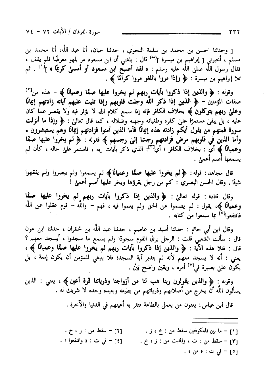 وَقَوْله تَعَالَى " وَاَلَّذِينَ إِذَا ذُكِّرُوا بِآيَاتِ رَبّهمْ لَمْ يَخِرُّوا عَلَيْهَا صُمًّا وَعُمْيَانًا " وَهَذِهِ أَيْضًا مِنْ صِفَات الْمُؤْمِنِينَ " الَّذِينَ إِذَا ذُكِرَ اللَّه وَجِلَتْ قُلُوبهمْ وَإِذَا تُلِيَتْ عَلَيْهِمْ آيَاته زَادَتْهُمْ إِيمَانًا وَعَلَى رَبّهمْ يَتَوَكَّلُونَ " بِخِلَافِ الْكَافِر فَإِنَّهُ إِذَا سَمِعَ كَلَام اللَّه لَا يُؤَثِّر فِيهِ وَلَا يَتَغَيَّر عَمَّا كَانَ عَلَيْهِ بَلْ يَبْقَى مُسْتَمِرًّا عَلَى كُفْره وَطُغْيَانه وَجَهْله وَضَلَاله كَمَا قَالَ تَعَالَى " وَإِذَا مَا أُنْزِلَتْ سُورَة فَمِنْهُمْ مَنْ يَقُول أَيّكُمْ زَادَتْهُ هَذِهِ إِيمَانًا فَأَمَّا الَّذِينَ آمَنُوا فَزَادَتْهُمْ إِيمَانًا وَهُمْ يَسْتَبْشِرُونَ وَأَمَّا الَّذِينَ فِي قُلُوبهمْ مَرَض فَزَادَتْهُمْ رِجْسًا إِلَى رِجْسهمْ" فَقَوْله " لَمْ يَخِرُّوا عَلَيْهَا صُمًّا وَعُمْيَانًا " أَيْ بِخِلَافِ الْكَافِر الَّذِي إِذَا سَمِعَ آيَات اللَّه فَلَا تُؤَثِّر فِيهِ فَيَسْتَمِرّ عَلَى حَاله كَأَنْ لَمْ يَسْمَعهَا أَصَمّ أَعْمَى قَالَ مُجَاهِد قَوْله" لَمْ يَخِرُّوا عَلَيْهَا صُمًّا وَعُمْيَانًا " قَالَ لَمْ يَسْمَعُوا وَلَمْ يُبْصِرُوا وَلَمْ يَفْقَهُوا شَيْئًا وَقَالَ الْحَسَن الْبَصْرِيّ رَضِيَ اللَّه عَنْهُ : كَمْ مِنْ رَجُل يَقْرَؤُهَا وَيَخِرّ عَلَيْهَا أَصَمّ أَعْمَى وَقَالَ قَتَادَة قَوْله تَعَالَى " وَاَلَّذِينَ إِذَا ذُكِّرُوا بِآيَاتِ رَبّهمْ لَمْ يَخِرُّوا عَلَيْهَا صُمًّا وَعُمْيَانًا" يَقُول لَمْ يَصُمُّوا عَنْ الْحَقّ وَلَمْ يُعْمُوا فِيهِ فَهُمْ وَاَللَّه قَوْم عَقَلُوا عَنْ الْحَقّ وَانْتَفَعُوا بِمَا سَمِعُوا مِنْ كِتَابه وَقَالَ اِبْن أَبِي حَاتِم حَدَّثَنَا أُسَيْد بْن عَاصِم حَدَّثَنَا عَبْد اللَّه بْن حُمْرَان ثَنَا اِبْن عَوْن قَالَ سَأَلْت الشَّعْبِيّ قُلْت الرَّجُل يَرَى الْقَوْم سُجُودًا وَلَمْ يَسْمَع مَا سَجَدُوا أَيَسْجُدُ مَعَهُمْ ؟ قَالَ فَتَلَا هَذِهِ الْآيَة : يَعْنِي أَنَّهُ لَا يَسْجُد مَعَهُمْ لِأَنَّهُ لَمْ يَتَدَبَّر أَمْر السُّجُود وَلَا يَنْبَغِي لِلْمُؤْمِنِ أَنْ يَكُون إِمَّعَة بَلْ يَكُون عَلَى بَصِيرَة فِي أَمْره وَيَقِين وَاضِح بَيِّن وَقَوْله تَعَالَى" وَاَلَّذِينَ يَقُولُونَ رَبّنَا هَبْ لَنَا مِنْ أَزْوَاجنَا وَذُرِّيَّاتنَا قُرَّة أَعْيُن " يَعْنِي الَّذِينَ يَسْأَلُونَ اللَّه أَنْ يُخْرِج مِنْ أَصْلَابهمْ مِنْ ذُرِّيَّاتهمْ مَنْ يُطِيعهُ وَيَعْبُدهُ وَحْده لَا شَرِيك لَهُ قَالَ اِبْن عَبَّاس يَعْنُونَ مَنْ يَعْمَل بِطَاعَةِ اللَّه فَتَقَرّ بِهِ أَعْيُنهمْ فِي الدُّنْيَا وَالْآخِرَة 333@@@