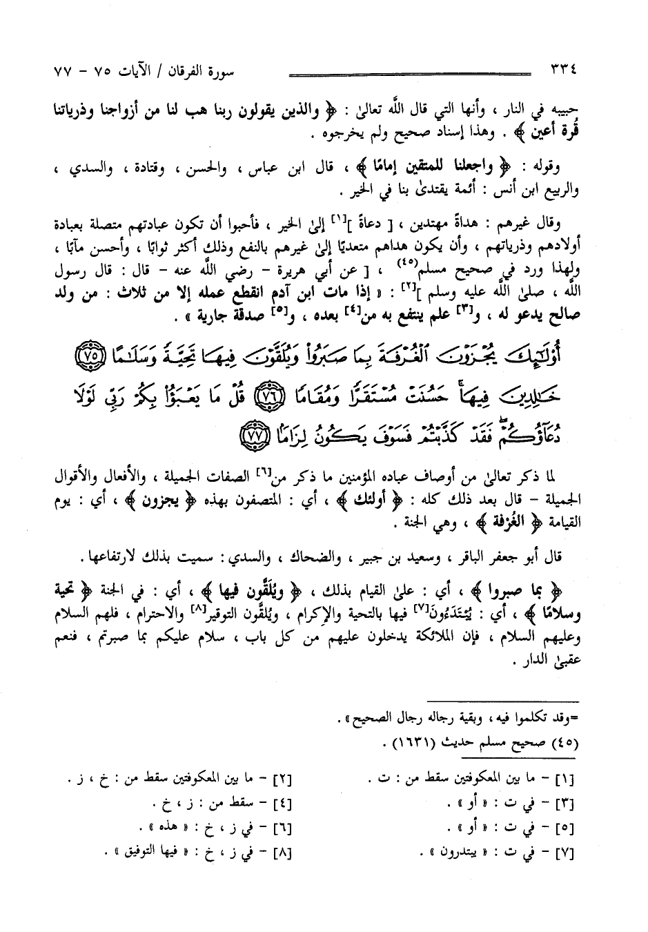 لَمَّا ذَكَرَ تَعَالَى مِنْ أَوْصَاف عِبَاده الْمُؤْمِنِينَ مَا ذَكَرَ مِنْ الصِّفَات الْجَمِيلَة وَالْأَقْوَال وَالْأَفْعَال الْجَلِيلَة قَالَ بَعْد ذَلِكَ كُلّه " أُولَئِكَ " أَيْ الْمُتَّصِفُونَ بِهَذِهِ " يُجْزَوْنَ " يَوْم الْقِيَامَة " الْغُرْفَة" وَهِيَ الْجَنَّة قَالَ أَبُو جَعْفَر الْبَاقِر وَسَعِيد بْن جُبَيْر وَالضَّحَّاك وَالسُّدِّيّ سُمِّيَتْ بِذَلِكَ لِارْتِفَاعِهَا " بِمَا صَبَرُوا " أَيْ عَلَى الْقِيَام بِذَلِكَ " وَيُلَقَّوْنَ فِيهَا " أَيْ فِي الْجَنَّة " تَحِيَّة وَسَلَامًا " أَيْ يُبْتَدَرُونَ فِيهَا بِالتَّحِيَّةِ وَالْإِكْرَام وَيَلْقَوْنَ التَّوْقِير وَالِاحْتِرَام فَلَهُمْ السَّلَام وَعَلَيْهِمْ السَّلَام فَإِنَّ الْمَلَائِكَة يَدْخُلُونَ عَلَيْهِمْ مِنْ كُلّ بَاب سَلَام عَلَيْكُمْ بِمَا صَبَرْتُمْ فَنِعْمَ عُقْبَى الدَّار .