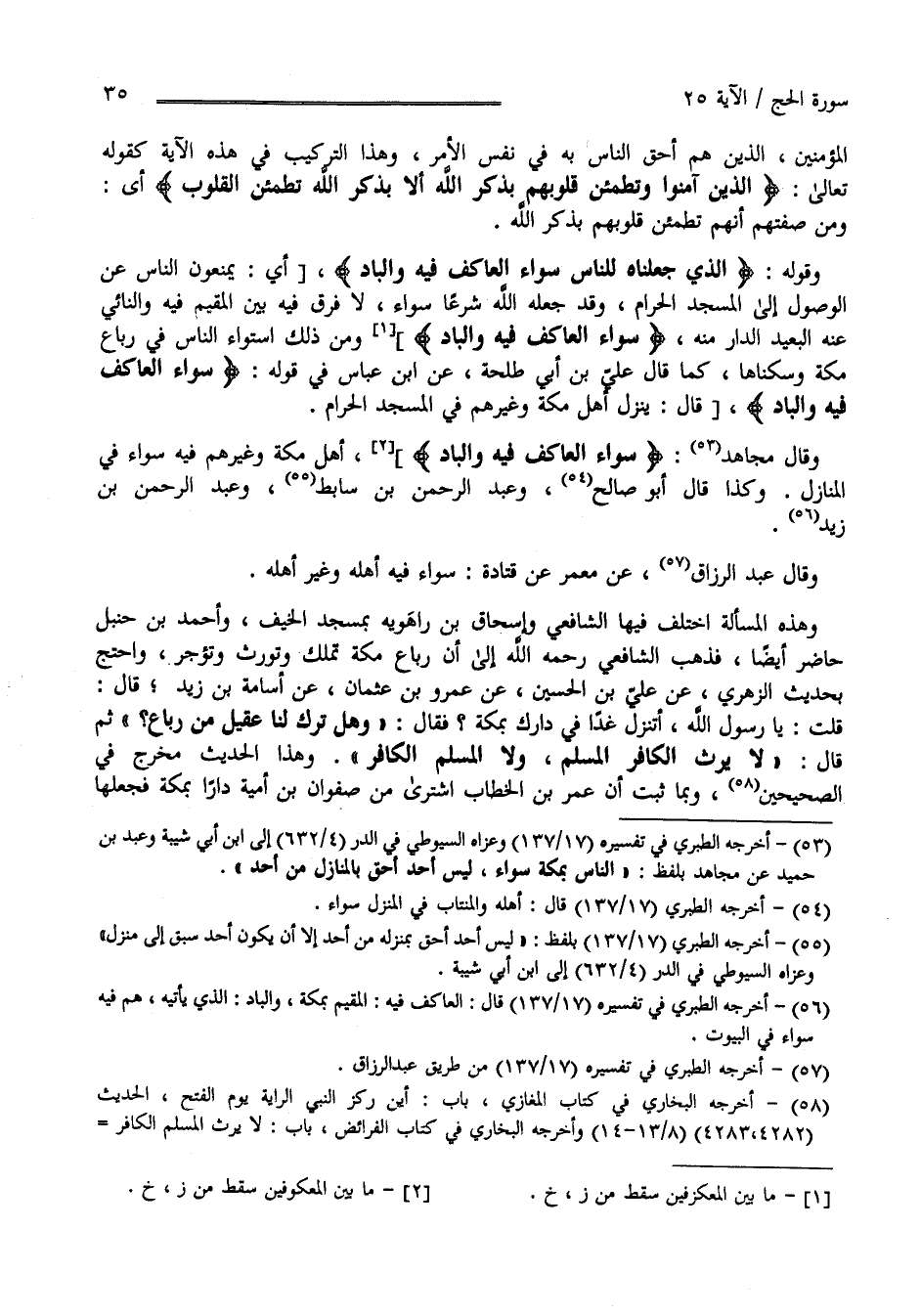 الْمُؤْمِنِينَ الَّذِينَ هُمْ أَحَقّ النَّاس بِهِ فِي نَفْس الْأَمْر وَهَذَا التَّرْتِيب فِي هَذِهِ الْآيَة كَقَوْلِهِ تَعَالَى " الَّذِينَ آمَنُوا وَتَطْمَئِنّ قُلُوبهمْ بِذِكْرِ اللَّه أَلَا بِذِكْرِ اللَّه تَطْمَئِنّ الْقُلُوب " أَيْ وَمِنْ صِفَتهمْ أَنَّهُمْ تَطْمَئِنّ قُلُوبهمْ بِذِكْرِ اللَّه " وَقَوْله " الَّذِي جَعَلْنَاهُ لِلنَّاسِ سَوَاء الْعَاكِف فِيهِ وَالْبَاد " أَيْ يَمْنَعُونَ النَّاس عَنْ الْوُصُول إِلَى الْمَسْجِد الْحَرَام وَقَدْ جَعَلَهُ اللَّه شَرْعًا سَوَاء لَا فَرْق فِيهِ بَيْن الْمُقِيم فِيهِ وَالنَّائِي عَنْهُ الْبَعِيد الدَّار مِنْهُ " سَوَاء الْعَاكِف فِيهِ وَالْبَاد " وَمِنْ ذَلِكَ اِسْتِوَاء النَّاس فِي رِبَاع مَكَّة وَسُكْنَاهَا كَمَا قَالَ عَلِيّ بْن أَبِي طَلْحَة عَنْ اِبْن عَبَّاس فِي قَوْله " سَوَاء الْعَاكِف فِيهِ وَالْبَاد" قَالَ يَنْزِل أَهْل مَكَّة وَهُمْ فِي الْمَسْجِد الْحَرَام وَقَالَ مُجَاهِد سَوَاء الْعَاكِف فِيهِ وَالْبَاد " أَهْل مَكَّة وَغَيْرهمْ فِيهِ سَوَاء فِي الْمَنَازِل وَكَذَا قَالَ أَبُو صَالِح وَعَبْد الرَّحْمَن بْن سَابِط وَعَبْد الرَّحْمَن بْن زَيْد بْن أَسْلَم وَقَالَ عَبْد الرَّزَّاق عَنْ مَعْمَر عَنْ قَتَادَة سَوَاء فِيهِ أَهْله وَغَيْر أَهْله وَهَذِهِ الْمَسْأَلَة هِيَ الَّتِي اِخْتَلَفَ فِيهَا الشَّافِعِيّ وَإِسْحَاق بْن رَاهَوَيْهِ بِمَسْجِدِ الْخَيْف وَأَحْمَد بْن حَنْبَل حَاضِر أَيْضًا فَذَهَبَ الشَّافِعِيّ رَحِمَهُ اللَّه إِلَى أَنَّ رِبَاع مَكَّة تُمْلَك وَتُوَرَّث وَتُؤَجَّر وَاحْتَجَّ بِحَدِيثِ الزُّهْرِيّ عَنْ عَلِيّ بْن الْحَسَن عَنْ عَمْرو بْن عُثْمَان عَنْ أُسَامَة بْن زَيْد قَالَ قُلْت يَا رَسُول اللَّه أَنَنْزِلُ غَدًا فِي دَارِكَ بِمَكَّة ؟ فَقَالَ " وَهَلْ تَرَكَ لَنَا عَقِيل مِنْ رِبَاع " ثُمَّ قَالَ " لَا يَرِث الْكَافِر الْمُسْلِم وَلَا الْمُسْلِم الْكَافِر" وَهَذَا الْحَدِيث مُخَرَّج فِي الصَّحِيحَيْنِ وَبِمَا ثَبَتَ أَنَّ عُمَر بْن الْخَطَّاب اِشْتَرَى مِنْ صَفْوَان بْن أُمَيَّة دَارًا بِمَكَّة فَجَعَلَهَا