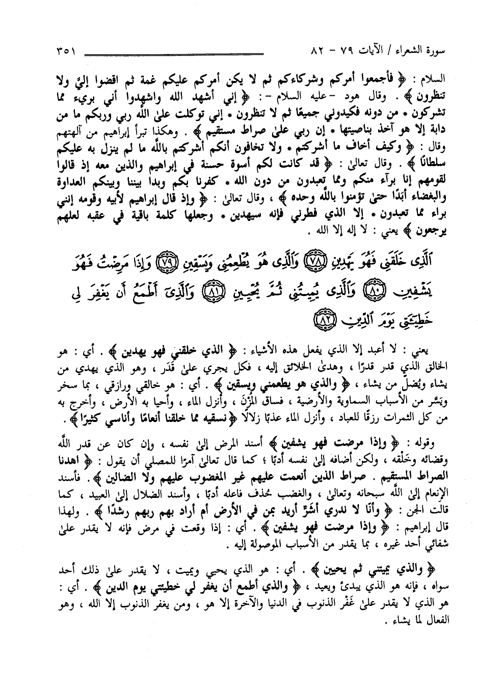 يَعْنِي لَا أَعْبُد إِلَّا الَّذِي يَفْعَل هَذِهِ الْأَشْيَاء " الَّذِي خَلَقَنِي فَهُوَ يَهْدِينِ" أَيْ هُوَ الْخَالِق الَّذِي قَدَّرَ قَدَرًا وَهَدَى الْخَلَائِق إِلَيْهِ فَكُلّ يَجْرِي عَلَى مَا قُدِّرَ لَهُ وَهُوَ الَّذِي يَهْدِي مَنْ يَشَاء وَيُضِلّ مَنْ يَشَاء .