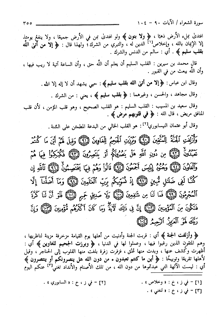 وَقَالَ اِبْن عَبَّاس " إِلَّا مَنْ أَتَى اللَّه بِقَلْبٍ سَلِيم " الْقَلْب السَّلِيم أَنْ يَشْهَد أَنْ لَا إِلَه إِلَّا اللَّه وَقَالَ مُجَاهِد وَالْحَسَن وَغَيْرهمَا " بِقَلْبٍ سَلِيم " يَعْنِي مِنْ الشِّرْك وَقَالَ سَعِيد بْن الْمُسَيِّب الْقَلْب السَّلِيم هُوَ الْقَلْب الصَّحِيح وَهُوَ قَلْب الْمُؤْمِن لِأَنَّ قَلْب الْكَافِر وَالْمُنَافِق مَرِيض قَالَ اللَّه تَعَالَى : " فِي قُلُوبهمْ مَرَض " قَالَ أَبُو عُثْمَان النَّيْسَابُورِيّ هُوَ الْقَلْب السَّالِم مِنْ الْبِدْعَة الْمُطْمَئِنّ إِلَى السُّنَّة .