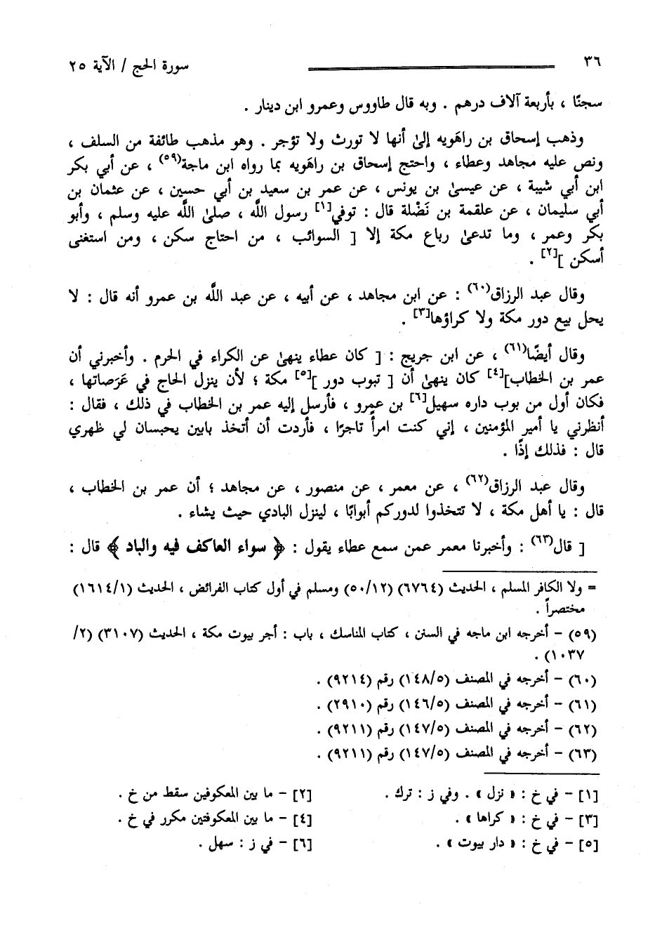 عُثْمَان بْن أَبِي سُلَيْمَان عَنْ عَلْقَمَة بْن نَضْلَة قَالَ : تُوُفِّيَ رَسُول اللَّه صَلَّى اللَّه عَلَيْهِ وَسَلَّمَ وَأَبُو بَكْر وَعُمَر وَمَا تُدْعَى رِبَاع مَكَّة إِلَّا السَّوَائِب مَنْ اِحْتَاجَ سَكَنَ وَمَنْ اِسْتَغْنَى أَسْكَنَ وَقَالَ عَبْد الرَّزَّاق بْن مُجَاهِد عَنْ أَبِيهِ عَنْ عَبْد اللَّه بْن عَمْرو أَنَّهُ قَالَ لَا يَحِلّ بَيْع دُور مَكَّة وَلَا كِرَاؤُهَا وَقَالَ أَيْضًا عَنْ اِبْن جُرَيْج كَانَ عَطَاء يَنْهَى عَنْ الْكِرَاء فِي الْحَرَم وَأَخْبَرَنِي أَنَّ عُمَر بْن الْخَطَّاب كَانَ يَنْهَى عَنْ تَبْوِيب دُور مَكَّة لِأَنْ يَنْزِل الْحَاجّ فِي عَرَصَاتهَا فَكَانَ أَوَّل مَنْ بَوَّبَ دَاره سُهَيْل بْن عَمْرو فَأَرْسَلَ إِلَيْهِ عُمَر بْن الْخَطَّاب فِي ذَلِكَ فَقَالَ أَنْظِرْنِي يَا أَمِير الْمُؤْمِنِينَ إِنِّي كُنْت اِمْرَأً تَاجِرًا فَأَرَدْت أَنْ أَتَّخِذ بَابَيْنِ يَحْبِسَانِ لِي ظَهْرِي قَالَ فَلَك ذَلِكَ إِذًا وَقَالَ عَبْد الرَّزَّاق عَنْ مَعْمَر عَنْ مَنْصُور عَنْ مُجَاهِد أَنَّ عُمَر بْن الْخَطَّاب قَالَ يَا أَهْل مَكَّة لَا تَتَّخِذُوا لِدُورِكُمْ أَبْوَابًا لِيَنْزِل الْبَادِي حَيْثُ يَشَاء قَالَ وَأَخْبَرَنَا مَعْمَر عَمَّنْ سَمِعَ عَطَاء يَقُول" سَوَاء الْعَاكِف فِيهِ وَالْبَاد " قَالَ