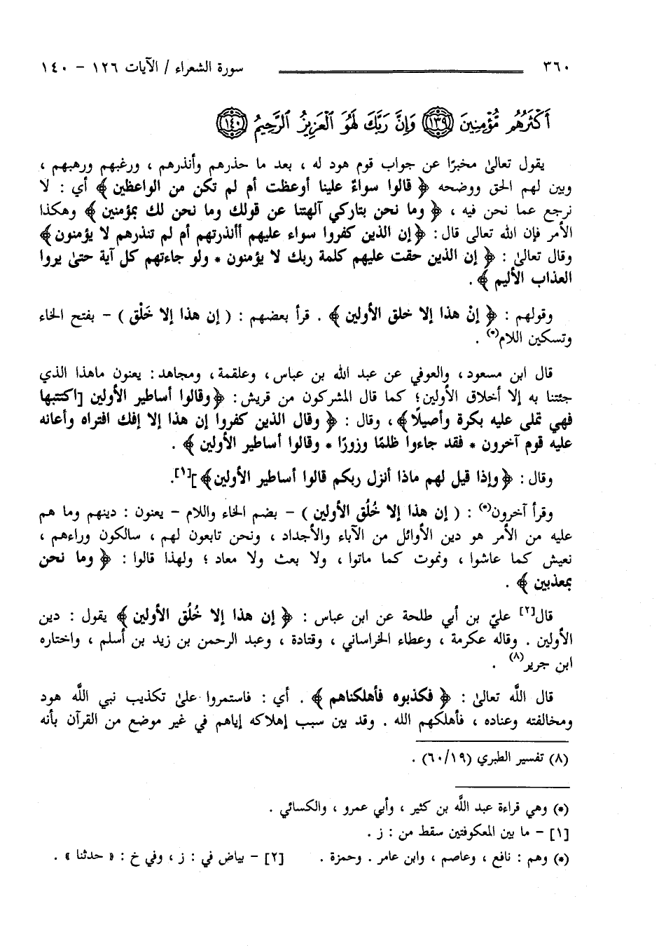 وَقَوْلهمْ " إِنْ هَذَا إِلَّا خُلُق الْأَوَّلِينَ " قَرَأَ بَعْضهمْ " إِنْ هَذَا إِلَّا خَلْقُ الْأَوَّلِينَ " بِفَتْحِ الْخَاء وَتَسْكِين اللَّام قَالَ اِبْن مَسْعُود وَالْعَوْفِيّ عَنْ عَبْد اللَّه بْن عَبَّاس وَعَلْقَمَة وَمُجَاهِد يَعْنُونَ مَا هَذَا الَّذِي جِئْتنَا بِهِ إِلَّا أَخْلَاق الْأَوَّلِينَ كَمَا قَالَ الْمُشْرِكُونَ مِنْ قُرَيْش " وَقَالُوا أَسَاطِير الْأَوَّلِينَ اِكْتَتَبَهَا فَهِيَ تُمْلَى عَلَيْهِ بُكْرَة وَأَصِيلًا " وَقَالَ : " وَقَالَ الَّذِينَ كَفَرُوا إِنْ هَذَا إِلَّا إِفْك اِفْتَرَاهُ وَأَعَانَهُ عَلَيْهِ قَوْم آخَرُونَ فَقَدْ جَاءُوا ظُلْمًا وَزُورًا وَقَالُوا أَسَاطِير الْأَوَّلِينَ " وَقَالَ : " وَإِذَا قِيلَ لَهُمْ مَاذَا أَنْزَلَ رَبّكُمْ قَالُوا أَسَاطِير الْأَوَّلِينَ " وَقَرَأَ آخَرُونَ " إِنْ هَذَا إِلَّا خُلُق الْأَوَّلِينَ " بِضَمِّ الْخَاء وَاللَّام يَعْنُونَ دِينهمْ وَمَا هُمْ عَلَيْهِ مِنْ الْأَمْر هُوَ دِين الْأَوَّلِينَ مِنْ الْآبَاء وَالْأَجْدَاد وَنَحْنُ تَابِعُونَ لَهُمْ سَالِكُونَ وَرَاءَهُمْ نَعِيش كَمَا عَاشُوا وَنَمُوت كَمَا مَاتُوا وَلَا بَعْث وَلَا مَعَاد .