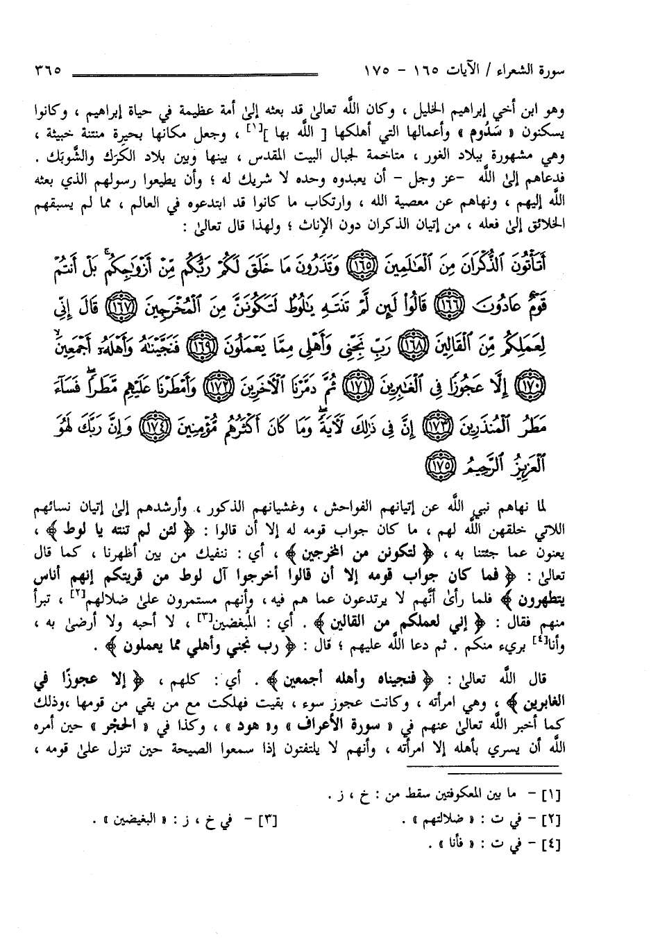 يَقُول تَعَالَى مُخْبِرًا عَنْ عَبْده وَرَسُوله لُوط عَلَيْهِ السَّلَام وَهُوَ لُوط بْن هَارَان بْن آزَار وَهُوَ اِبْن أَخِي إِبْرَاهِيم الْخَلِيل عَلَيْهِ السَّلَام وَكَانَ اللَّه تَعَالَى قَدْ بَعَثَهُ إِلَى أُمَّة عَظِيمَة فِي حَيَاة إِبْرَاهِيم عَلَيْهِمَا السَّلَام وَكَانُوا يَسْكُنُونَ سَدُوم وَأَعْمَالهَا الَّتِي أَهْلَكَهَا اللَّه بِهَا وَجَعَلَ مَكَانهَا بُحَيْرَة مُنْتِنَة خَبِيثَة وَهِيَ مَشْهُورَة بِبِلَادِ الْغَوْر بِنَاحِيَةٍ مُتَاخِمَة لِجِبَالِ الْبَيْت الْمُقَدَّس بَيْنهَا وَبَيْن بِلَاد الْكَرْك والشوبك فَدَعَاهُمْ إِلَى اللَّه عَزَّ وَجَلَّ أَنْ يَعْبُدُوهُ وَحْده لَا شَرِيك لَهُ وَأَنْ يُطِيعُوا رَسُولهمْ الَّذِي بَعَثَهُ اللَّه إِلَيْهِمْ وَنَهَاهُمْ عَنْ مَعْصِيَة اللَّه وَارْتِكَاب مَا كَانُوا قَدْ اِبْتَدَعُوهُ فِي الْعَالَم مِمَّا لَمْ يَسْبِقهُمْ أَحَد مِنْ الْخَلَائِق إِلَى فِعْله مِنْ إِتْيَان الذُّكُور دُون الْإِنَاث .