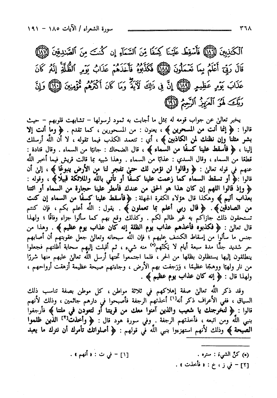 وَلِهَذَا قَالَ تَعَالَى " فَكَذَّبُوهُ فَأَخَذَهُمْ عَذَاب يَوْم الظُّلَّة إِنَّهُ كَانَ عَذَاب يَوْم عَظِيم " وَهَذَا مِنْ جِنْس مَا سَأَلُوهُ مِنْ إِسْقَاط الْكِسَف عَلَيْهِمْ فَإِنَّ اللَّه سُبْحَانه وَتَعَالَى جَعَلَ عُقُوبَتهمْ أَنْ أَصَابَهُمْ حَرّ عَظِيم مُدَّة سَبْعَة أَيَّام لَا يُكِنُّهُمْ مِنْهُ شَيْء ثُمَّ أَقْبَلَتْ إِلَيْهِمْ سَحَابَة أَظَلَّتْهُمْ فَجَعَلُوا يَنْطَلِقُونَ إِلَيْهَا يَسْتَظِلُّونَ بِظِلِّهَا مِنْ الْحَرّ فَلَمَّا اِجْتَمَعُوا كُلّهمْ تَحْتهَا أَرْسَلَ اللَّه تَعَالَى عَلَيْهِمْ مِنْهَا شَرَرًا مِنْ نَار وَلَهَبًا وَوَهَجًا عَظِيمًا وَرَجَفَتْ بِهِمْ الْأَرْض وَجَاءَتْهُمْ صَيْحَة عَظِيمَة أَزْهَقَتْ أَرْوَاحهمْ وَلِهَذَا قَالَ تَعَالَى " إِنَّهُ كَانَ عَذَاب يَوْم عَظِيم " وَقَدْ ذَكَرَ اللَّه تَعَالَى صِفَة إِهْلَاكهمْ فِي ثَلَاثَة مَوَاطِن كُلّ مَوْطِن بِصِفَةِ تُنَاسِب ذَلِكَ السِّيَاق فَفِي الْأَعْرَاف ذَكَرَ أَنَّهُمْ أَخَذَتْهُمْ الرَّجْفَة فَأَصْبَحُوا فِي دَارهمْ جَاثِمِينَ وَذَلِكَ لِأَنَّهُمْ قَالُوا " لَنُخْرِجَنَّكَ يَا شُعَيْب وَاَلَّذِينَ آمَنُوا مَعَك مِنْ قَرْيَتنَا أَوْ لَتَعُودُنَّ فِي مِلَّتنَا " فَأَرْجَفُوا نَبِيّ اللَّه وَمَنْ اِتَّبَعَهُ فَأَخَذَتْهُمْ الرَّجْفَة وَفِي سُورَة هُود قَالَ " فَأَخَذَتْهُمْ الصَّيْحَة " وَذَلِكَ لِأَنَّهُمْ اِسْتَهْزَءُوا بِنَبِيِّ اللَّه فِي قَوْلهمْ " أَصَلَاتك تَأْمُرك أَنْ نَتْرُك مَا يَعْبُد