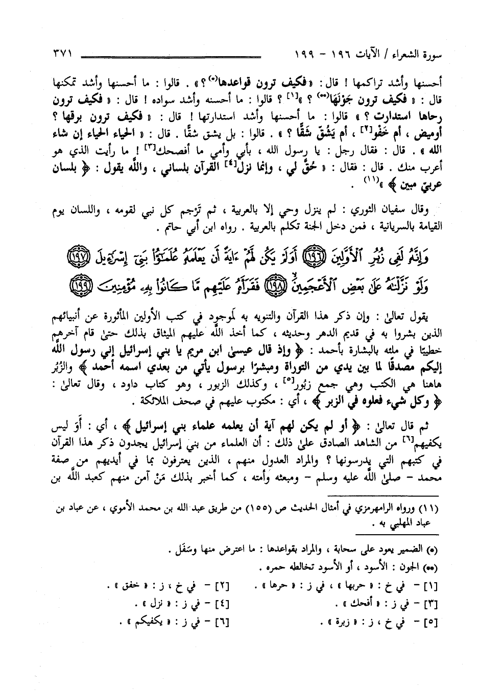 ثُمَّ قَالَ تَعَالَى " أَوَلَمْ يَكُنْ لَهُمْ آيَة أَنْ يَعْلَمهُ عُلَمَاء بَنِي إِسْرَائِيل " أَيْ أَوَلَيْسَ يَكْفِيهِمْ مِنْ الشَّاهِد الصَّادِق عَلَى ذَلِكَ أَنَّ الْعُلَمَاء مِنْ بَنِي إِسْرَائِيل يَجِدُونَ ذِكْر هَذَا الْقُرْآن فِي كُتُبهمْ الَّتِي يَدْرُسُونَهَا وَالْمُرَاد الْعُدُول مِنْهُمْ الَّذِينَ يَعْتَرِفُونَ بِمَا فِي أَيْدِيهمْ مِنْ صِفَة مُحَمَّد صَلَّى اللَّه عَلَيْهِ وَسَلَّمَ وَمَبْعَثه وَأُمَّته كَمَا أَخْبَرَ بِذَلِكَ مَنْ آمَنَ مِنْهُمْ كَعَبْدِ اللَّه بْن