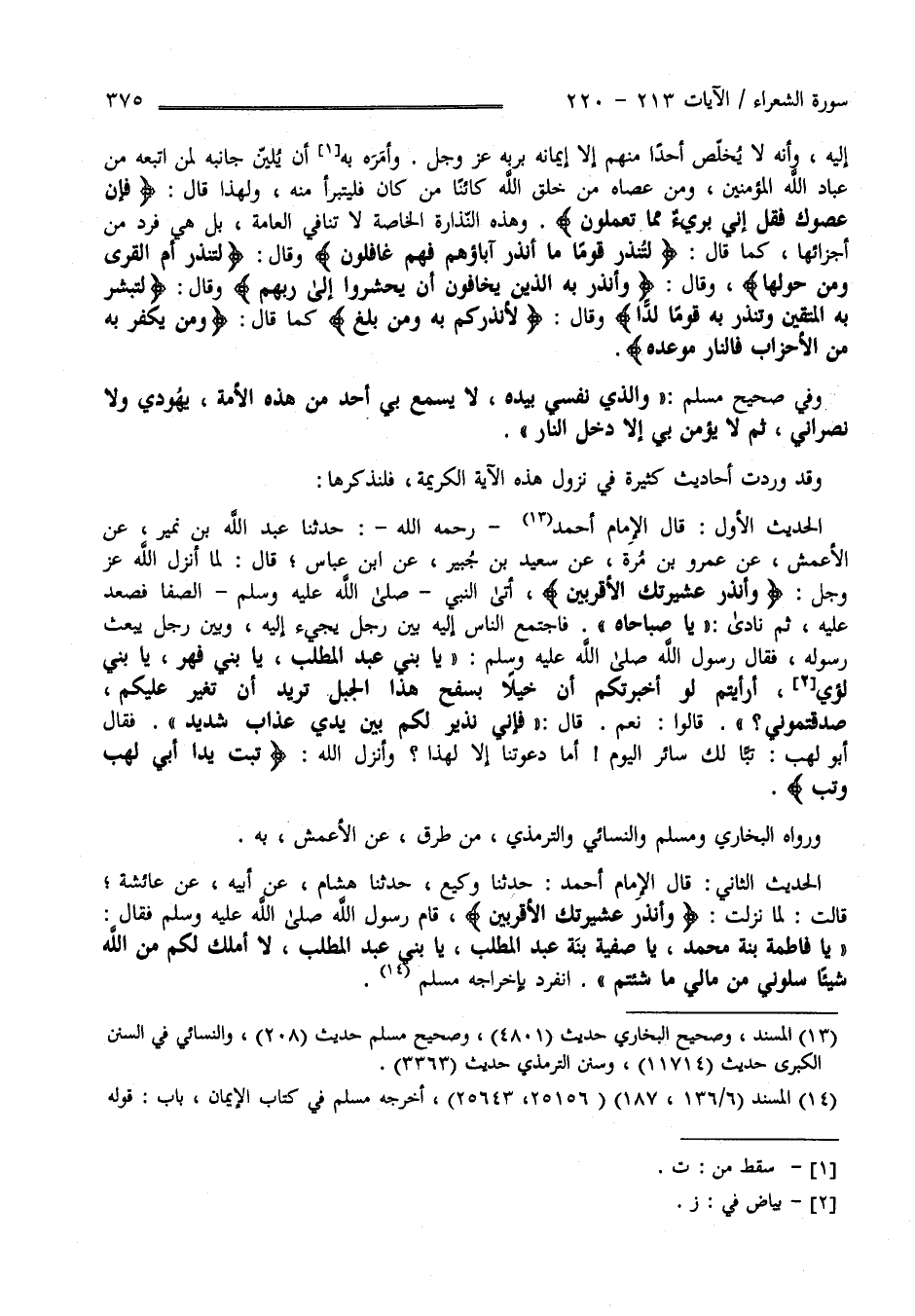 وَقَدْ وَرَدَتْ أَحَادِيث كَثِيرَة فِي نُزُول هَذِهِ الْآيَة الْكَرِيمَة فَلْنَذْكُرْهَا " الْحَدِيث الْأَوَّل " : قَالَ الْإِمَام أَحْمَد رَحِمَهُ اللَّه حَدَّثَنَا عَبْد اللَّه بْن نُمَيْر عَنْ الْأَعْمَش عَنْ عَمْرو بْن مُرَّة عَنْ سَعِيد بْن جُبَيْر عَنْ اِبْن عَبَّاس رَضِيَ اللَّه عَنْهُمَا قَالَ : لَمَّا أَنْزَلَ اللَّه عَزَّ وَجَلَّ " وَأَنْذِرْ عَشِيرَتك الْأَقْرَبِينَ" أَتَى النَّبِيّ صَلَّى اللَّه عَلَيْهِ وَسَلَّمَ الصَّفَا فَصَعِدَ عَلَيْهِ ثُمَّ نَادَى " يَا صَبَاحَاهُ " فَاجْتَمَعَ النَّاس إِلَيْهِ بَيْن رَجُل يَجِيء إِلَيْهِ وَبَيْن رَجُل يَبْعَث رَسُوله فَقَالَ رَسُول اللَّه صَلَّى اللَّه عَلَيْهِ وَسَلَّمَ " يَا بَنِي عَبْد الْمُطَّلِب ; يَا بَنِي فِهْر ; يَا بَنِي لُؤَيّ أَرَأَيْتُمْ لَوْ أَخْبَرْتُكُمْ أَنَّ خَيْلًا بِسَفْحِ هَذَا الْجَبَل تُرِيد أَنْ تُغِير عَلَيْكُمْ صَدَّقْتُمُونِي ؟ " قَالُوا نَعَمْ قَالَ " فَإِنِّي نَذِير لَكُمْ بَيْن يَدَيْ عَذَاب شَدِيد " فَقَالَ أَبُو لَهَب تَبًّا لَك سَائِر الْيَوْم أَمَّا دَعَوْتنَا إِلَّا لِهَذَا ؟ وَأَنْزَلَ اللَّه " تَبَّتْ يَدَا أَبِي لَهَب وَتَبَّ " وَرَوَاهُ الْبُخَارِيّ وَمُسْلِم وَالتِّرْمِذِيّ وَالنَّسَائِيّ مِنْ طُرُق عَنْ الْأَعْمَش بِهِ " الْحَدِيث الثَّانِي" : قَالَ الْإِمَام أَحْمَد حَدَّثَنَا وَكِيع حَدَّثَنَا هِشَام عَنْ أَبِيهِ عَنْ عَائِشَة قَالَتْ : لَمَّا نَزَلَتْ " وَأَنْذِرْ عَشِيرَتك الْأَقْرَبِينَ " قَامَ رَسُول اللَّه صَلَّى اللَّه عَلَيْهِ وَسَلَّمَ فَقَالَ " يَا فَاطِمَة اِبْنَة مُحَمَّد يَا صَفِيَّة اِبْنَة عَبْد الْمُطَّلِب يَا بَنِي عَبْد الْمُطَّلِب لَا أَمْلِك لَكُمْ مِنْ اللَّه شَيْئًا سَلُونِي مِنْ مَالِي مَا شِئْتُمْ " اِنْفَرَدَ بِإِخْرَاجِهِ مُسْلِم