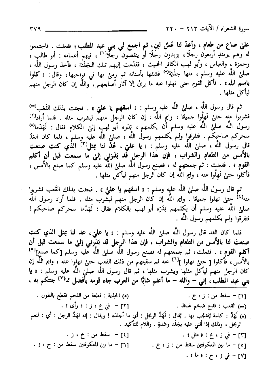 عَلَى صَاعٍ مِنْ طَعَامٍ وَأَعِدَّ لَنَا عُسّ لَبَن ثُمَّ اِجْمَعْ لِي بَنِي عَبْد الْمُطَّلِب " فَفَعَلْت فَاجْتَمَعُوا إِلَيْهِ وَهُمْ يَوْمئِذٍ أَرْبَعُونَ رَجُلًا يَزِيدُونَ رَجُلًا أَوْ يَنْقُصُونَ رَجُلًا فِيهِمْ أَعْمَامه أَبُو طَالِب وَحَمْزَة وَالْعَبَّاس وَأَبُو لَهَب الْكَافِر الْخَبِيث فَقَدَّمْت إِلَيْهِمْ تِلْكَ الْجَفْنَة فَأَخَذَ مِنْهَا رَسُول اللَّه صَلَّى اللَّه عَلَيْهِ وَسَلَّمَ جَذْبَة فَشَقَّهَا بِأَسْنَانِهِ ثُمَّ رَمَى بِهَا فِي نَوَاحِيهَا وَقَالَ" كُلُوا بِسْمِ اللَّه " فَأَكَلَ الْقَوْم حَتَّى نَهِلُوا عَنْهُ مَا يَرَى إِلَّا آثَار أَصَابِعهمْ وَاَللَّه إِنْ كَانَ الرَّجُل مِنْهُمْ لَيَأْكُل مِثْلهَا ثُمَّ قَالَ رَسُول اللَّه صَلَّى اللَّه عَلَيْهِ وَسَلَّمَ " اِسْقِهِمْ يَا عَلِيّ " فَجِئْت بِذَلِكَ الْقَعْب فَشَرِبُوا مِنْهُ حَتَّى نَهِلُوا جَمِيعًا وَاَيْم اللَّه إِنْ كَانَ الرَّجُل مِنْهُمْ لَيَشْرَب مِثْله فَلَمَّا أَرَادَ رَسُول اللَّه صَلَّى اللَّه عَلَيْهِ وَسَلَّمَ أَنْ يُكَلِّمهُمْ بَدَرَهُ أَبُو لَهَب إِلَى الْكَلَام فَقَالَ : لَهَدَّ مَا سَحَرَكُمْ صَاحِبكُمْ فَتَفَرَّقُوا وَلَمْ يُكَلِّمهُمْ رَسُول اللَّه صَلَّى اللَّه عَلَيْهِ وَسَلَّمَ فَلَمَّا كَانَ الْغَد قَالَ رَسُول اللَّه صَلَّى اللَّه عَلَيْهِ وَسَلَّمَ " يَا عَلِيّ عُدْ لَنَا بِمِثْلِ الَّذِي كُنْت صَنَعْت بِالْأَمْسِ مِنْ الطَّعَام وَالشَّرَاب