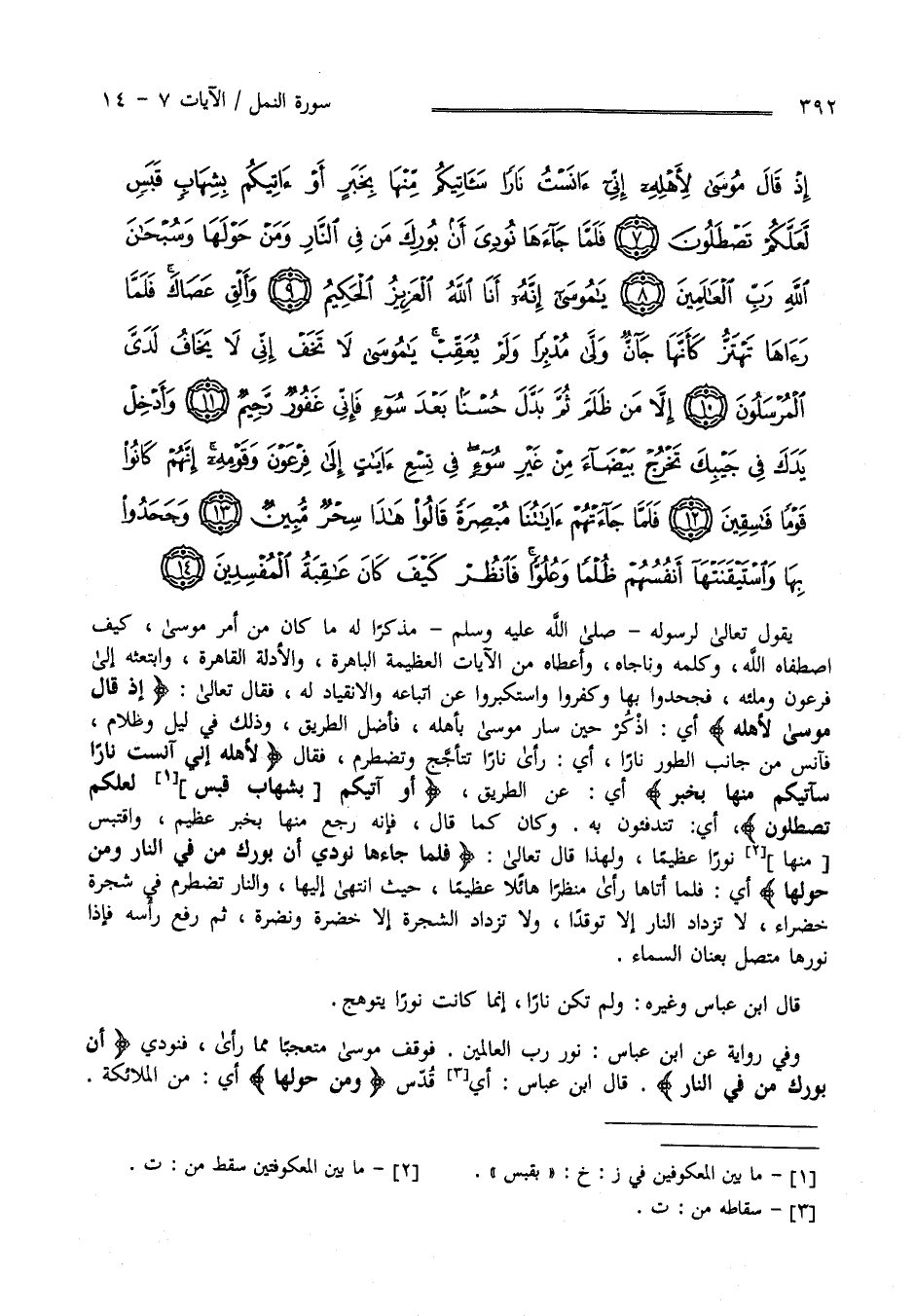 إِذْ قَالَ مُوسَى لِأَهْلِهِ إِنِّي آنَسْتُ نَارًا سَآتِيكُمْ مِنْهَا بِخَبَرٍ أَوْ آتِيكُمْ بِشِهَابٍ قَبَسٍ لَعَلَّكُمْ تَصْطَلُونَ