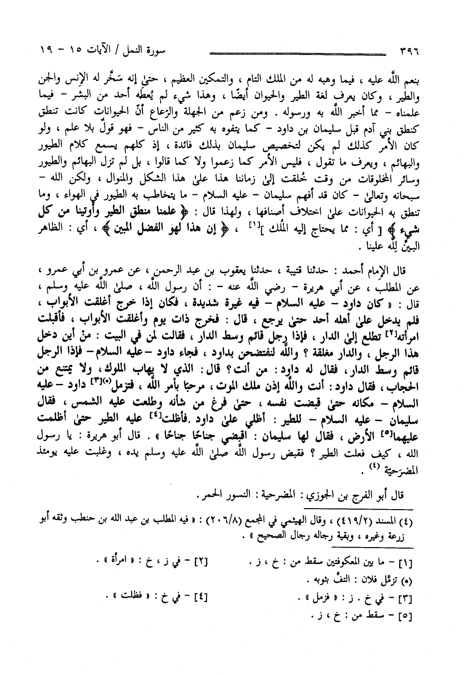 بِنِعَمِ اللَّه عَلَيْهِ فِيمَا وَهَبَهُ لَهُ مِنْ الْمُلْك التَّامّ وَالتَّمْكِين الْعَظِيم حَتَّى إِنَّهُ سَخَّرَ لَهُ الْإِنْس وَالْجِنّ وَالطَّيْر وَكَانَ يَعْرِف لُغَة الطَّيْر وَالْحَيَوَان أَيْضًا وَهَذَا شَيْء لَمْ يُعْطَهُ أَحَد مِنْ الْبَشَر فِيمَا عَلِمْنَاهُ مِمَّا أَخْبَرَ اللَّه بِهِ وَرَسُوله وَمَنْ زَعَمَ مِنْ الْجَهَلَة وَالرَّعَاع أَنَّ الْحَيَوَانَات كَانَتْ تَنْطِق كَنُطْقِ بَنِي آدَم قَبْل سُلَيْمَان بْن دَاوُد كَمَا قَدْ يَتَفَوَّه بِهِ كَثِير مِنْ النَّاس فَهُوَ قَوْل بِلَا عِلْم , وَلَوْ كَانَ الْأَمْر كَذَلِكَ لَمْ يَكُنْ لِتَخْصِيصِ سُلَيْمَان بِذَلِكَ فَائِدَة إِذْ كُلّهمْ يَسْمَع كَلَام الطُّيُور وَالْبَهَائِم وَيَعْرِف مَا تَقُول وَلَيْسَ الْأَمْر كَمَا زَعَمُوا وَلَا كَمَا قَالُوا بَلْ لَمْ تَزَلْ الْبَهَائِم وَالطُّيُور وَسَائِر الْمَخْلُوقَات مِنْ وَقْت خُلِقَتْ إِلَى زَمَاننَا هَذَا عَلَى هَذَا الشَّكْل وَالْمِنْوَال وَلَكِنَّ اللَّه سُبْحَانه كَانَ قَدْ أَفْهَمَ سُلَيْمَان مَا يَتَخَاطَب بِهِ الطُّيُور فِي الْهَوَاء وَمَا تَنْطِق بِهِ الْحَيَوَانَات عَلَى اِخْتِلَاف أَصْنَافهَا وَلِهَذَا قَالَ تَعَالَى" عُلِّمْنَا مَنْطِق الطَّيْر وَأُوتِينَا مِنْ كُلّ شَيْء " أَيْ مِمَّا يَحْتَاج إِلَيْهِ الْمُلْك " إِنَّ هَذَا لَهُوَ الْفَضْل الْمُبِين" أَيْ الظَّاهِر الْبَيِّن لِلَّهِ عَلَيْنَا قَالَ الْإِمَام أَحْمَد حَدَّثَنَا قُتَيْبَة حَدَّثَنَا يَعْقُوب بْن عَبْد الرَّحْمَن عَنْ عَمْرو بْن أَبِي عَمْرو عَنْ الْمُطَّلِب عَنْ أَبِي هُرَيْرَة رَضِيَ اللَّه عَنْهُ أَنَّ رَسُول اللَّه صَلَّى اللَّه عَلَيْهِ وَسَلَّمَ قَالَ : " كَانَ دَاوُد عَلَيْهِ السَّلَام فِيهِ غَيْرَة شَدِيدَة فَكَانَ إِذَا خَرَجَ أُغْلِقَتْ الْأَبْوَاب فَلَمْ يَدْخُل عَلَى أَهْله أَحَد حَتَّى يَرْجِع قَالَ فَخَرَجَ ذَات يَوْم وَأُغْلِقَتْ الْأَبْوَاب فَأَقْبَلَتْ اِمْرَأَة تَطَّلِع إِلَى الدَّار فَإِذَا رَجُل قَائِم وَسَط الدَّار فَقَالَتْ لِمَنْ فِي الْبَيْت مِنْ أَيْنَ دَخَلَ هَذَا الرَّجُل وَالدَّار مُغْلَقَة ؟ وَاَللَّه لَنُفْتَضَحَنَّ بِدَاوُدَ فَجَاءَ دَاوُد " فَإِذَا الرَّجُل قَائِم وَسَط الدَّار فَقَالَ لَهُ دَاوُد مَنْ أَنْتَ ؟ فَقَالَ الَّذِي لَا يَهَاب الْمُلُوك وَلَا يَمْتَنِع مِنْ الْحُجَّاب فَقَالَ دَاوُد أَنْتَ إِذًا وَاَللَّه مَلَك الْمَوْت مَرْحَبًا بِأَمْرِ اللَّه فَتَزَمَّلَ دَاوُد مَكَانه حَتَّى قُبِضَتْ نَفْسه حَتَّى فَرَغَ مِنْ شَأْنه وَطَلَعَتْ عَلَيْهِ الشَّمْس فَقَالَ سُلَيْمَان عَلَيْهِ السَّلَام لِلطَّيْرِ أَظِلِّي دَاوُد فَظَلَّلَتْ عَلَيْهِ الطَّيْر حَتَّى أَظْلَمَتْ عَلَيْهِ الْأَرْض فَقَالَ لَهَا سُلَيْمَان اِقْبِضِي