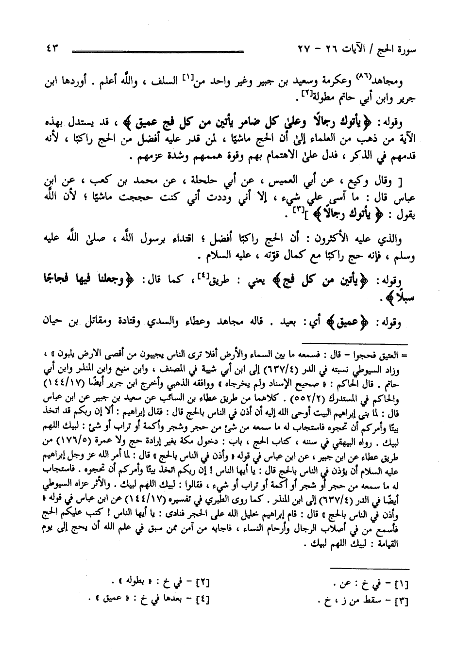 وَمُجَاهِد وَعِكْرِمَة وَسَعِيد بْن جُبَيْر وَغَيْر وَاحِد مِنْ السَّلَف وَاَللَّه أَعْلَم وَأَوْرَدَهَا اِبْن جَرِير وَابْن أَبِي حَاتِم مُطَوَّلَة وَقَوْله " يَأْتُوك رِجَالًا وَعَلَى كُلّ ضَامِر " الْآيَة قَدْ يُسْتَدَلّ بِهَذِهِ الْآيَة مَنْ ذَهَبَ مِنْ الْعُلَمَاء إِلَى أَنَّ الْحَجّ مَاشِيًا لِمَنْ قَدَرَ عَلَيْهِ أَفْضَل مِنْ الْحَجّ رَاكِبًا لِأَنَّهُ قَدَّمَهُمْ فِي الذِّكْر فَدَلَّ عَلَى الِاهْتِمَام بِهِمْ وَقُوَّة هِمَمهمْ وَشِدَّة عَزْمهمْ وَقَالَ وَكِيع عَنْ أَبِي الْعُمَيْس عَنْ أَبِي حَلْحَلَة عَنْ مُحَمَّد بْن كَعْب عَنْ اِبْن عَبَّاس قَالَ شَيْء إِلَّا أَنِّي وَدِدْت أَنِّي كُنْت حَجَجْت مَاشِيًا لِأَنَّ اللَّه يَقُول " يَأْتُوك رِجَالًا " وَاَلَّذِي عَلَيْهِ الْأَكْثَرُونَ أَنَّ الْحَجّ رَاكِبًا أَفْضَل اِقْتِدَاء بِرَسُولِ اللَّه صَلَّى اللَّه عَلَيْهِ وَسَلَّمَ فَإِنَّهُ حَجّ رَاكِبًا مَعَ كَمَالِ قُوَّته عَلَيْهِ السَّلَام وَقَوْله " يَأْتِينَ مِنْ كُلّ فَجّ " يَعْنِي طَرِيق كَمَا قَالَ " وَجَعَلْنَا فِيهَا فِجَاجًا سُبُلًا " وَقَوْله " عَمِيق " أَيْ بَعِيد قَالَهُ مُجَاهِد وَعَطَاء وَالسُّدِّيّ وَقَتَادَة وَمُقَاتِل اِبْن حَيَّان