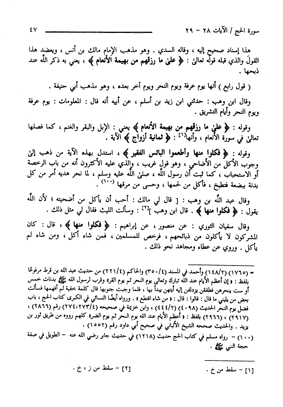بَعْده وَهُوَ مَذْهَب أَبِي حَنِيفَة وَقَالَ اِبْن وَهْب حَدَّثَنِي اِبْن زَيْد بْن أَسْلَم عَنْ أَبِيهِ أَنَّهُ قَالَ الْمَعْلُومَات يَوْم عَرَفَة وَيَوْم النَّحْر وَأَيَّام التَّشْرِيق وَقَوْله " عَلَى مَا رَزَقَهُمْ مِنْ بَهِيمَة الْأَنْعَام " يَعْنِي الْإِبِل وَالْبَقَر وَالْغَنَم كَمَا فَصَّلَهَا تَعَالَى فِي سُورَة الْأَنْعَام " ثَمَانِيَة أَزْوَاج" الْآيَة فَكُلُوا مِنْهَا وَأَطْعِمُوا الْبَائِس الْفَقِير " اِسْتَدَلَّ بِهَذِهِ الْآيَة مَنْ ذَهَبَ إِلَى وُجُوب الْأَكْل مِنْ الْأَضَاحِيّ وَهُوَ قَوْل غَرِيب وَاَلَّذِي عَلَيْهِ الْأَكْثَرُونَ أَنَّهُ مِنْ بَاب الرُّخْصَة أَوْ الِاسْتِحْبَاب كَمَا ثَبَتَ أَنَّ رَسُول اللَّه صَلَّى اللَّه عَلَيْهِ وَسَلَّمَ لَمَّا نَحَرَ هَدْيه أَمَرَ مِنْ كُلّ بَدَنَة بِبَضْعَةٍ فَتُطْبَخ فَأَكَلَ مِنْ لَحْمهَا وَحَسَا مِنْ مَرَقهَا قَالَ عَبْد اللَّه بْن وَهْب قَالَ لِي مَالِك أُحِبّ أَنْ يَأْكُل مِنْ أُضْحِيَّته لِأَنَّ اللَّه يَقُول " فَكُلُوا مِنْهَا" قَالَ اِبْن وَهْب وَسَأَلْت اللَّيْث فَقَالَ لِي مِثْل ذَلِكَ وَقَالَ سُفْيَان الثَّوْرِيّ عَنْ مَنْصُور عَنْ إِبْرَاهِيم " فَكُلُوا مِنْهَا" قَالَ كَانَ الْمُشْرِكُونَ لَا يَأْكُلُونَ مِنْ ذَبَائِحهمْ فَرَخَّصَ لِلْمُسْلِمِينَ فَمَنْ شَاءَ أَكَلَ وَمَنْ لَمْ يَشَأْ لَمْ يَأْكُل وَرُوِيَ عَنْ مُجَاهِد وَعَطَاء نَحْو ذَلِكَ