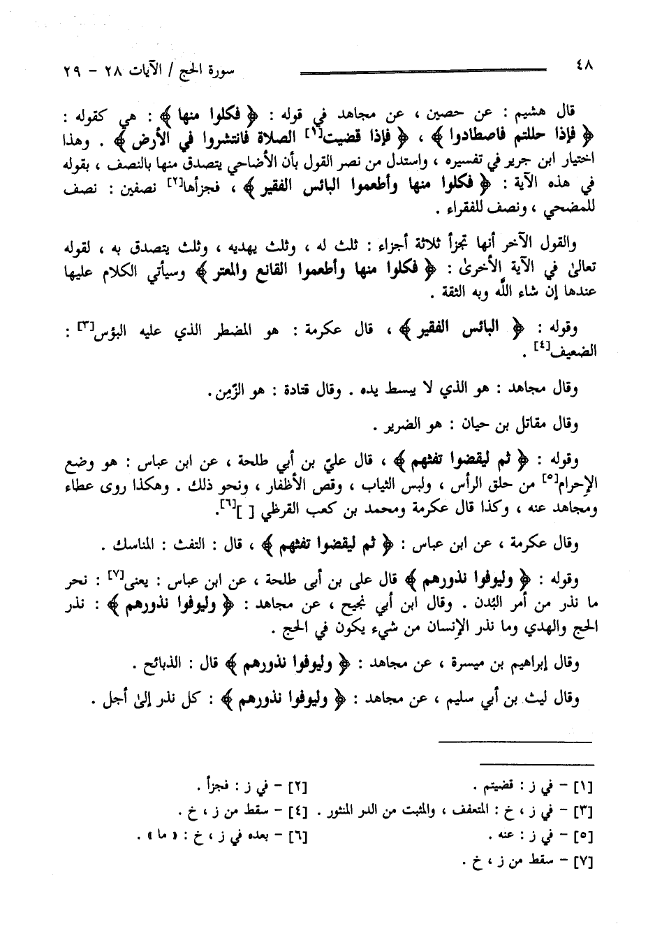 وَقَوْله " ثُمَّ لْيَقْضُوا تَفَثهمْ " قَالَ عَلِيّ بْن أَبِي طَلْحَة عَنْ اِبْن عَبَّاس هُوَ وَضْع الْإِحْرَام مِنْ حَلْق الرَّأْس وَلُبْس الثِّيَاب وَقَصّ الْأَظَافِر وَنَحْو ذَلِكَ وَهَكَذَا رَوَى عَطَاء وَمُجَاهِد عَنْهُ وَكَذَا قَالَ عِكْرِمَة وَمُحَمَّد بْن كَعْب الْقُرَظِيّ وَقَالَ عِكْرِمَة عَنْ اِبْن عَبَّاس " ثُمَّ لْيَقْضُوا تَفَثهمْ " قَالَ التَّفَث الْمَنَاسِك وَقَوْله " وَلْيُوفُوا نُذُورهمْ " قَالَ عَلِيّ بْن أَبِي طَلْحَة عَنْ اِبْن عَبَّاس يَعْنِي نَحَرَ مَا نَذَرَ مِنْ أَمْر الْبُدْن وَقَالَ اِبْن أَبِي نَجِيح عَنْ مُجَاهِد " وَلْيُوفُوا نُذُورهمْ " نَذْر الْحَجّ وَالْهَدْي وَمَا نَذَرَ الْإِنْسَان مِنْ شَيْء يَكُون فِي الْحَجّ وَقَالَ إِبْرَاهِيم بْن مَيْسَرَة عَنْ مُجَاهِد " وَلْيُوفُوا نُذُورهمْ " قَالَ الذَّبَائِح وَقَالَ لَيْث بْن أَبِي سُلَيْم عَنْ مُجَاهِد " وَلْيُوفُوا نُذُورهمْ" كُلّ نَذْر إِلَى أَجَل