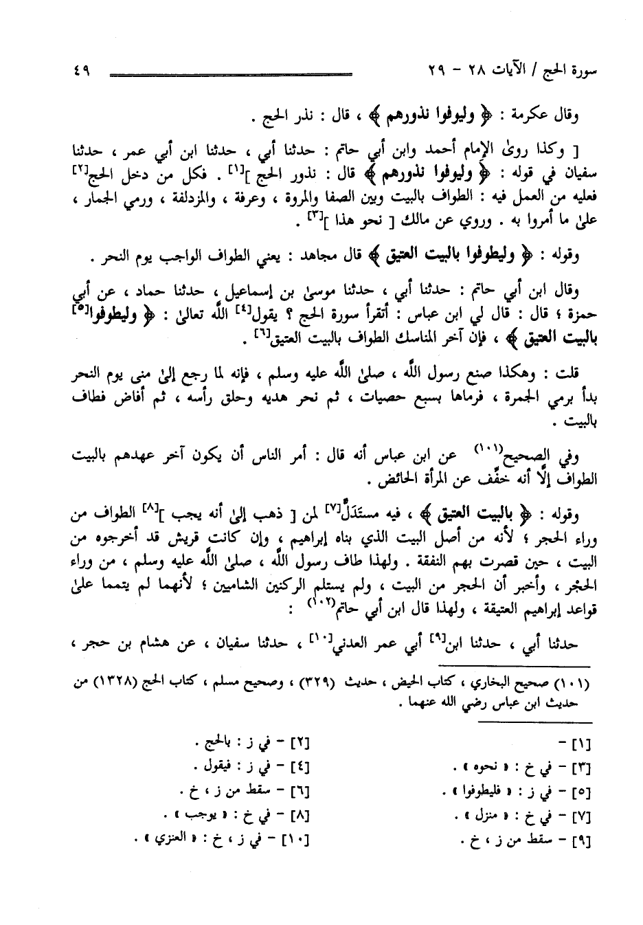 وَقَالَ عِكْرِمَة " وَلْيُوفُوا نُذُورهمْ" قَالَ حَجّهمْ وَكَذَا رَوَى الْإِمَام أَحْمَد وَابْن أَبِي حَاتِم حَدَّثَنَا أَبِي حَدَّثَنَا اِبْن أَبِي عُمَر حَدَّثَنَا سُفْيَان فِي قَوْله " وَلْيُوفُوا نُذُورهمْ " قَالَ نُذُور الْحَجّ فَكُلّ مَنْ دَخَلَ الْحَجّ فَعَلَيْهِ مِنْ الْعَمَل فِيهِ الطَّوَاف بِالْبَيْتِ وَبَيْن الصَّفَا وَالْمَرْوَة وَعَرَفَة وَمُزْدَلِفَة وَرَمْي الْجِمَار عَلَى مَا أُمِرُوا بِهِ وَرُوِيَ عَنْ مَالِك نَحْو هَذَا وَقَوْله" وَلْيَطَّوَّفُوا بِالْبَيْتِ الْعَتِيق " قَالَ مُجَاهِد يَعْنِي الطَّوَاف الْوَاجِب يَوْم النَّحْر وَقَالَ اِبْن أَبِي حَاتِم حَدَّثَنَا أَبِي حَدَّثَنَا مُوسَى بْن إِسْمَاعِيل حَدَّثَنَا حَمَّاد عَنْ أَبِي حَمْزَة قَالَ : قَالَ لِي اِبْن عَبَّاس أَتَقْرَأُ سُورَة الْحَجّ يَقُول اللَّه تَعَالَى " وَلْيَطَّوَّفُوا بِالْبَيْتِ الْعَتِيق " فَإِنَّ آخِر الْمَنَاسِك الطَّوَاف بِالْبَيْتِ الْعَتِيق : قُلْت وَهَكَذَا صَنَعَ رَسُول اللَّه صَلَّى اللَّه عَلَيْهِ وَسَلَّمَ فَإِنَّهُ لَمَّا رَجَعَ إِلَى مِنًى يَوْم النَّحْر بَدَأَ بِرَمْيِ الْجَمْرَة فَرَمَاهَا بِسَبْعِ حَصَيَات ثُمَّ نَحَرَ هَدْيه وَحَلَقَ رَأْسه ثُمَّ أَفَاضَ فَطَافَ بِالْبَيْتِ وَفِي الصَّحِيحَيْنِ عَنْ اِبْن عَبَّاس أَنَّهُ قَالَ أَمَرَ النَّاس أَنْ يَكُون آخِر عَهْدهمْ بِالْبَيْتِ الطَّوَاف إِلَّا أَنَّهُ خَفَّفَ عَنْ الْمَرْأَة الْحَائِض وَقَوْله " بِالْبَيْتِ الْعَتِيق " فِيهِ مُسْتَدَلّ لِمَنْ ذَهَبَ إِلَى أَنَّهُ يَجِب الطَّوَاف مِنْ وَرَاء الْحِجْر لِأَنَّهُ مِنْ أَصْل الْبَيْت الَّذِي بَنَاهُ إِبْرَاهِيم وَإِنْ كَانَتْ قُرَيْش قَدْ أَخْرَجُوهُ مِنْ الْبَيْت حِين قَصُرَتْ بِهِمْ النَّفَقَة وَلِهَذَا طَافَ رَسُول اللَّه صَلَّى اللَّه عَلَيْهِ وَسَلَّمَ مِنْ وَرَاء الْحِجْر وَأَخْبَرَ أَنَّ الْحِجْر مِنْ الْبَيْت وَلَمْ يَسْتَلِم الرُّكْنَيْنِ الشَّامِيَّيْنِ لِأَنَّهُمَا لَمْ يُتَمِّمَا عَلَى قَوَاعِد إِبْرَاهِيم الْعَتِيقَة وَلِهَذَا قَالَ اِبْن أَبِي حَاتِم حَدَّثَنَا أَبِي حَدَّثَنَا اِبْن أَبِي عُمَر الْعَدَنِيّ حَدَّثَنَا سُفْيَان عَنْ هِشَام بْن حُجْر