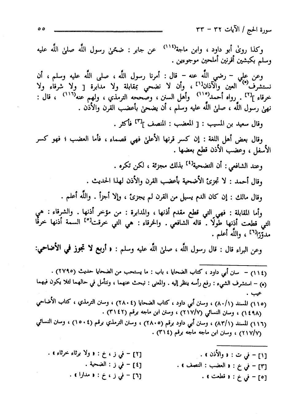 وَرَوَاهُ أَحْمَد وَأَهْل السُّنَن وَصَحَّحَهُ التِّرْمِذِيّ وَلَهُمْ عَنْهُ قَالَ نَهَى رَسُول اللَّه صَلَّى اللَّه عَلَيْهِ وَسَلَّمَ أَنْ نُضَحِّي بِأَعْضَب الْقَرْن وَالْأُذُن قَالَ سَعِيد بْن الْمُسَيِّب : الْعَضْب النِّصْف فَأَكْثَر وَقَالَ بَعْض أَهْل اللُّغَة : إِنْ كُسِرَ قَرْنهَا الْأَعْلَى فَهِيَ قَصْمَاء فَأَمَّا الْعَضْب فَهُوَ كَسْر الْأَسْفَل وَعَضْب الْأُذُن قَطْع بَعْضهَا وَعِنْد الشَّافِعِيّ أَنَّ الْأُضْحِيَّة بِذَلِكَ مُجْزِئَة لَكِنْ تُكْرَه وَقَالَ أَحْمَد لَا تُجْزِئ الْأُضْحِيَّة بِأَعْضَب الْقَرْن وَالْأُذُن لِهَذَا الْحَدِيث وَقَالَ مَالِك : إِنْ كَانَ الدَّم يَسِيل مِنْ الْقَرْن لَمْ يُجْزِئ وَإِلَّا أَجْزَأَ وَاَللَّه أَعْلَم وَأَمَّا الْمُقَابَلَة فَهِيَ الَّتِي قُطِعَ مُقَدَّم أُذُنهَا وَالْمُدَابَرَة مِنْ مُؤَخَّر أُذُنهَا وَالشَّرْقَاء هِيَ الَّتِي قُطِعَتْ أُذُنهَا طُولًا قَالَهُ الشَّافِعِيّ وَالْأَصْمَعِيّ وَأَمَّا الْخَرْقَاء فَهِيَ الَّتِي خَرَقَتْ السِّمَة أُذُنهَا خَرْقًا مُدَوَّرًا وَاَللَّه أَعْلَم .