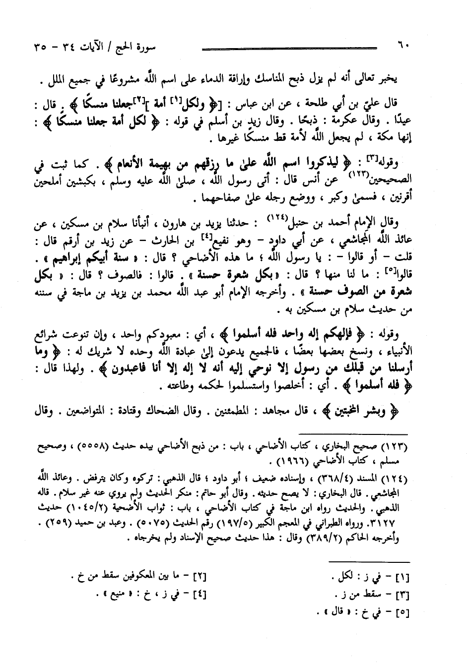 يُخْبِر تَعَالَى أَنَّهُ لَمْ يَزَلْ ذَبْح الْمَنَاسِك وَإِرَاقَة الدِّمَاء عَلَى اِسْم اللَّه مَشْرُوعًا فِي جَمِيع الْمِلَل وَقَالَ عَلِيّ بْن أَبِي طَلْحَة عَنْ اِبْن عَبَّاس " وَلِكُلِّ أُمَّة جَعَلْنَا مَنْسَكًا " قَالَ عِيدًا وَقَالَ عِكْرِمَة ذَبْحًا وَقَالَ زَيْد بْن أَسْلَم فِي قَوْله " وَلِكُلِّ أُمَّة جَعَلْنَا مَنْسَكًا " إِنَّهَا مَكَّة لَمْ يَجْعَل اللَّه لِأُمَّةٍ قَطُّ مَنْسَكًا غَيْرهَا وَقَوْله " لِيَذْكُرُوا اِسْم اللَّه عَلَى مَا رَزَقَهُمْ مِنْ بَهِيمَة الْأَنْعَام " كَمَا ثَبَتَ فِي الصَّحِيحَيْنِ عَنْ أَنَس قَالَ أَتَى رَسُول اللَّه صَلَّى اللَّه عَلَيْهِ وَسَلَّمَ بِكَبْشَيْنِ أَمْلَحَيْنِ أَقْرَنَيْنِ فَسَمَّى وَكَبَّرَ وَوَضَعَ رِجْله عَلَى صِفَاحهمَا قَالَ الْإِمَام أَحْمَد بْن حَنْبَل حَدَّثَنَا يَزِيد بْن هَارُون أَنْبَأَنَا سَلَّام بْن مِسْكِين عَنْ عَائِذ اللَّه الْمُجَاشِعِيّ عَنْ أَبِي دَاوُد - وَهُوَ نُفَيْع بْن الْحَارِث - عَنْ زَيْد بْن أَرْقَم قَالَ قُلْت أَوْ قَالُوا يَا رَسُول اللَّه مَا هَذِهِ الْأَضَاحِيّ ؟ قَالَ " سُنَّة أَبِيكُمْ إِبْرَاهِيم " قَالُوا مَا لَنَا مِنْهَا ؟ قَالَ : " بِكُلِّ شَعْرَة حَسَنَة " قَالَ فَالصُّوف ؟ قَالَ " بِكُلِّ شَعْرَة مِنْ الصُّوف حَسَنَة " وَأَخْرَجَهُ الْإِمَام أَبُو عَبْد اللَّه مُحَمَّد بْن يَزِيد اِبْن مَاجَهْ فِي سُنَنه مِنْ حَدِيث سَلَّام بْن مِسْكِين بِهِ وَقَوْله " فَإِلَهكُمْ إِلَه وَاحِد فَلَهُ أَسْلِمُوا " أَيْ مَعْبُودكُمْ وَاحِد وَإِنْ تَنَوَّعَتْ شَرَائِع الْأَنْبِيَاء وَنَسَخَ بَعْضهَا بَعْضًا فَالْجَمِيع يَدْعُونَ إِلَى عِبَادَة اللَّه وَحْده لَا شَرِيك لَهُ " وَمَا أَرْسَلْنَا مِنْ قَبْلك مِنْ رَسُول إِلَّا نُوحِي إِلَيْهِ أَنَّهُ لَا إِلَه إِلَّا أَنَا فَاعْبُدُونِ " وَلِهَذَا قَالَ " فَلَهُ أَسْلِمُوا " أَيْ أَخْلِصُوا وَاسْتَسْلِمُوا لِحُكْمِهِ وَطَاعَته " وَبَشِّرْ الْمُخْبِتِينَ " قَالَ مُجَاهِد الْمُطْمَئِنِّينَ وَقَالَ الضَّحَّاك وَقَتَادَة الْمُتَوَاضِعِينَ وَقَالَ