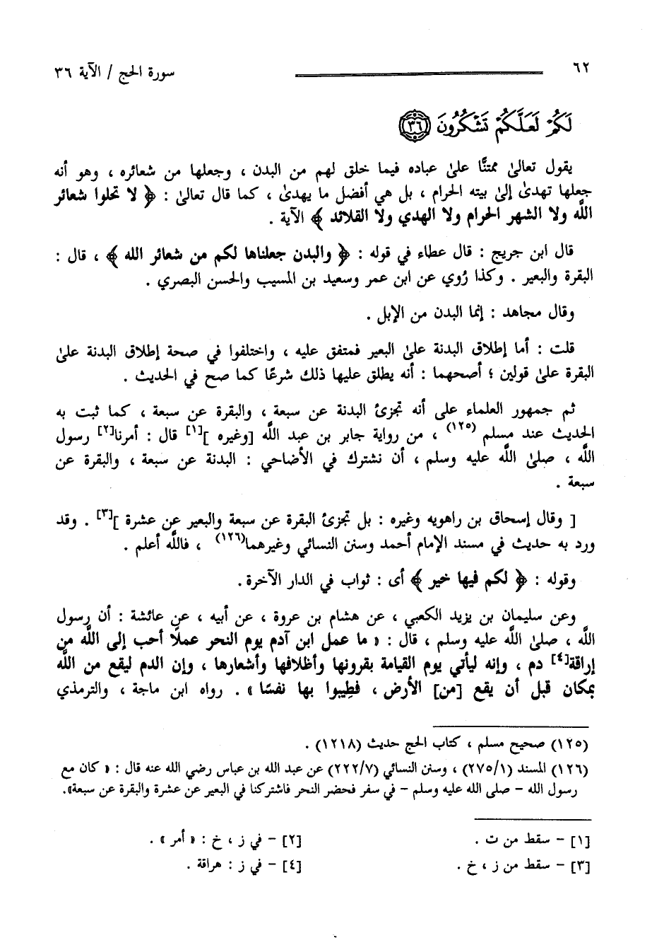 يَقُول تَعَالَى مُمْتَنًّا عَلَى عَبِيده فِيمَا خَلَقَ لَهُمْ مِنْ الْبُدْن وَجَعَلَهَا مِنْ شَعَائِره وَهُوَ أَنَّهُ جَعَلَهَا تُهْدَى إِلَى بَيْته الْحَرَام بَلْ هِيَ أَفْضَل مَا يُهْدَى إِلَيْهِ كَمَا قَالَ تَعَالَى " لَا تُحِلُّوا شَعَائِر اللَّه وَلَا الشَّهْر الْحَرَام وَلَا الْهَدْي وَلَا الْقَلَائِد وَلَا آمِّينَ الْبَيْت الْحَرَام " الْآيَة قَالَ اِبْن جُرَيْج قَالَ عَطَاء فِي قَوْله " وَالْبُدْن جَعَلْنَاهَا لَكُمْ مِنْ شَعَائِر اللَّه " قَالَ الْبَقَرَة وَالْبَعِير وَكَذَا رُوِيَ عَنْ اِبْن عُمَر وَسَعِيد بْن الْمُسَيِّب وَالْحَسَن الْبَصْرِيّ وَقَالَ مُجَاهِد إِنَّمَا الْبُدْن مِنْ الْإِبِل .