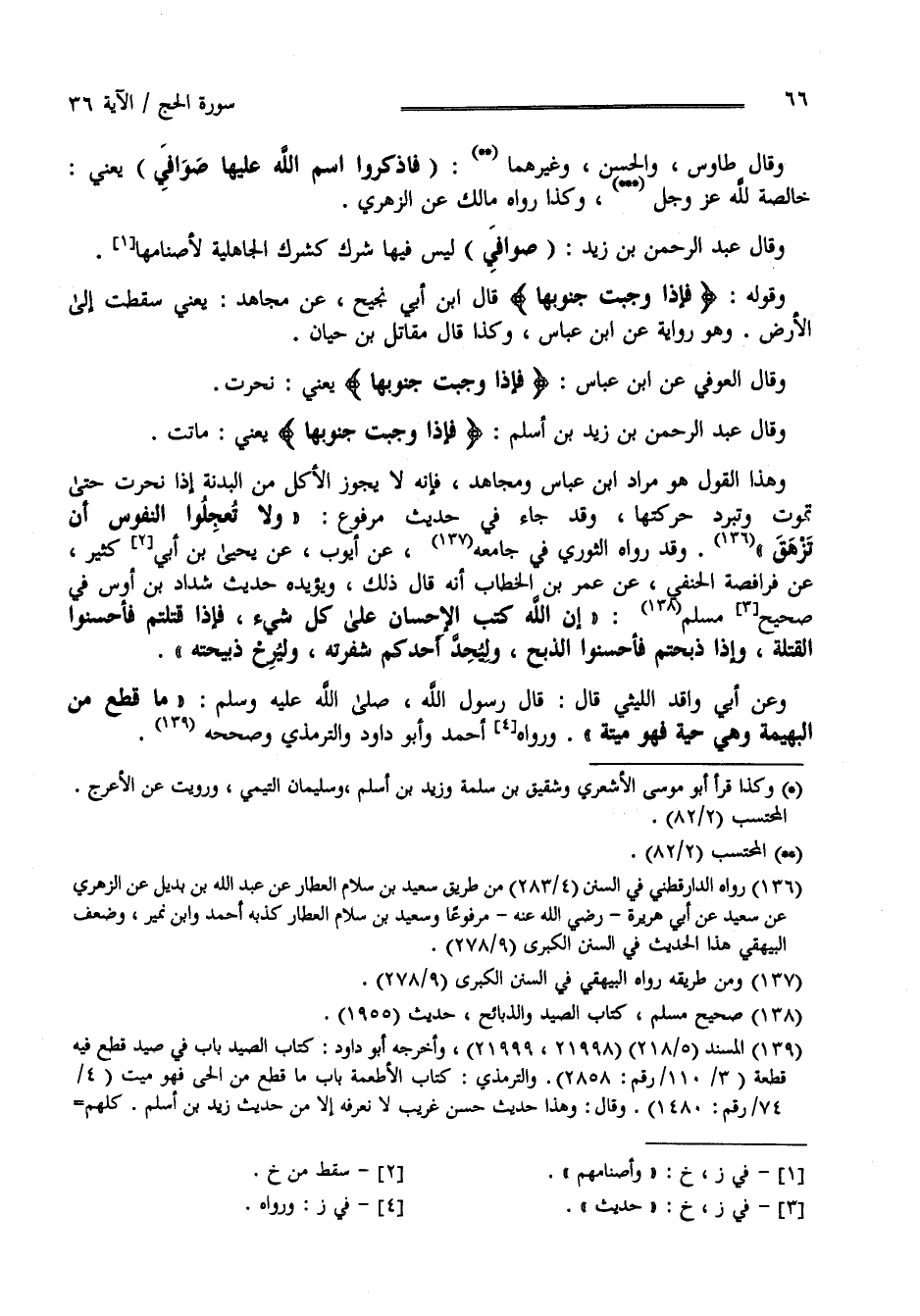 وَقَالَ طَاوُس وَالْحَسَن وَغَيْرهمَا " فَاذْكُرُوا اِسْم اللَّه عَلَيْهَا صَوَافِي" يَعْنِي خَالِصَة لِلَّهِ عَزَّ وَجَلَّ وَكَذَا رَوَاهُ مَالِك عَنْ الزُّهْرِيّ وَقَالَ عَبْد الرَّحْمَن بْن زَيْد صَوَافِي لَيْسَ فِيهَا شِرْك كَشِرْكِ الْجَاهِلِيَّة لِأَصْنَامِهِمْ وَقَوْله " فَإِذَا وَجَبَتْ جُنُوبهَا " قَالَ اِبْن أَبِي نَجِيح عَنْ مُجَاهِد يَعْنِي سَقَطَتْ إِلَى الْأَرْض وَهُوَ رِوَايَة عَنْ اِبْن عَبَّاس وَكَذَا قَالَ مُقَاتِل بْن حَيَّان وَقَالَ الْعَوْفِيّ عَنْ اِبْن عَبَّاس فَإِذَا وَجَبَتْ جُنُوبهَا يَعْنِي نُحِرَتْ وَقَالَ عَبْد الرَّحْمَن بْن زَيْد بْن أَسْلَم فَإِذَا وَجَبَتْ جُنُوبهَا يَعْنِي مَاتَتْ وَهَذَا الْقَوْل هُوَ مُرَاد اِبْن عَبَّاس وَمُجَاهِد فَإِنَّهُ لَا يَجُوز الْأَكْل مِنْ الْبَدَنَة إِذَا نُحِرَتْ حَتَّى تَمُوت وَتَبْرُد حَرَكَتهَا وَقَدْ جَاءَ فِي حَدِيث مَرْفُوع " لَا تَعْجَلُوا النُّفُوس أَنْ تَزْهَق" وَقَدْ رَوَاهُ الثَّوْرِيّ فِي جَامِعه عَنْ أَيُّوب عَنْ يَحْيَى بْن أَبِي كَثِير فُرَافِصَة الْحَنَفِيّ عَنْ عُمَر بْن الْخَطَّاب أَنَّهُ قَالَ ذَلِكَ وَيُؤَيِّدهُ حَدِيث شَدَّاد بْن أَوْس فِي صَحِيح مُسْلِم " إِنَّ اللَّه كَتَبَ الْإِحْسَان عَلَى كُلّ شَيْء فَإِذَا قَتَلْتُمْ فَأَحْسِنُوا الْقِتْلَة وَإِذَا ذَبَحْتُمْ فَأَحْسِنُوا الذِّبْحَة وَلْيُحِدَّ أَحَدكُمْ شَفْرَته وَلْيُرِحْ ذَبِيحَته " وَعَنْ أَبِي وَاقِد اللَّيْثِيّ قَالَ : قَالَ رَسُول اللَّه صَلَّى اللَّه عَلَيْهِ وَسَلَّمَ " مَا قُطِعَ مِنْ الْبَهِيمَة وَهِيَ حَيَّة فَهُوَ مَيْتَة " رَوَاهُ أَحْمَد وَأَبُو دَاوُد وَالتِّرْمِذِيّ وَصَحَّحَهُ