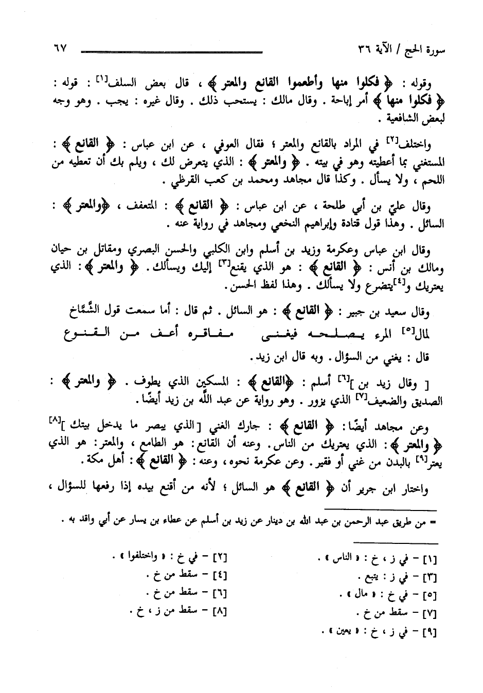 قَالَ يُغْنِي مِنْ السُّؤَال وَبِهِ قَالَ اِبْن زَيْد وَقَالَ زَيْد بْن أَسْلَم الْقَانِع الْمِسْكِين الَّذِي يَطُوف وَالْمُعْتَرّ الصَّدِيق وَالضَّعِيف الَّذِي يَزُور وَهُوَ رِوَايَة عَنْ اِبْنه عَبْد الرَّحْمَن بْن زَيْد أَيْضًا وَعَنْ مُجَاهِد أَيْضًا الْقَانِع جَارك الْغَنِيّ الَّذِي يُبْصِر مَا يَدْخُل بَيْتك وَالْمُعْتَرّ الَّذِي يَعْتَزِل مِنْ النَّاس وَعَنْهُ أَنَّ الْقَانِع هُوَ الطَّامِع وَالْمُعْتَرّ هُوَ الَّذِي يَعْتَرّ بِالْبُدْنِ مِنْ غَنِيّ أَوْ فَقِير وَعِكْرِمَة نَحْوه وَعَنْهُ الْقَانِع أَهْل مَكَّة وَاخْتَارَ اِبْن جَرِير أَنَّ الْقَانِع هُوَ السَّائِل لِأَنَّهُ مِنْ أَقْنَعَ بِيَدِهِ إِذَا رَفَعَهَا لِلسُّؤَالِ