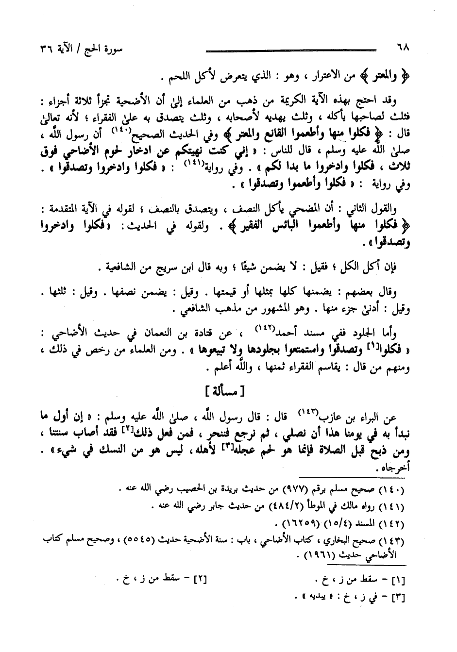 وَالْمُعْتَرّ مِنْ الِاعْتِرَاء وَهُوَ الَّذِي يَتَعَرَّض لِأَكْلِ اللَّحْم وَقَدْ اِحْتَجَّ بِهَذِهِ الْآيَة الْكَرِيمَة مَنْ ذَهَبَ مِنْ الْعُلَمَاء إِلَى أَنَّ الْأُضْحِيَّة تُجَزَّأ ثَلَاثَة أَجْزَاء فَثُلُث لِصَاحِبِهَا يَأْكُلهُ وَثُلُث يُهْدِيه لِأَصْحَابِهِ وَثُلُث يَتَصَدَّق بِهِ عَلَى الْفُقَرَاء لِأَنَّهُ تَعَالَى قَالَ " فَكُلُوا مِنْهَا وَأَطْعِمُوا الْقَانِع وَالْمُعْتَرّ " وَفِي الْحَدِيث الصَّحِيح أَنَّ رَسُول اللَّه صَلَّى اللَّه عَلَيْهِ وَسَلَّمَ قَالَ لِلنَّاسِ " إِنِّي كُنْت نَهَيْتُكُمْ عَنْ اِدِّخَار لُحُوم الْأَضَاحِيّ فَوْق ثَلَاث فَكُلُوا وَادَّخِرُوا مَا بَدَا لَكُمْ " وَفِي رِوَايَة " فَكُلُوا وَادَّخِرُوا وَتَصَدَّقُوا" وَفِي رِوَايَة " فَكُلُوا وَأَطْعِمُوا وَتَصَدَّقُوا " وَالْقَوْل الثَّانِي : إِنَّ الْمُضَحِّي يَأْكُل النِّصْف وَيَتَصَدَّق بِالنِّصْفِ لِقَوْلِهِ فِي الْآيَة الْمُتَقَدِّمَة " فَكُلُوا مِنْهَا وَأَطْعِمُوا الْبَائِس الْفَقِير " وَلِقَوْلِهِ فِي الْحَدِيث " فَكُلُوا وَادَّخِرُوا وَتَصَدَّقُوا " فَإِنْ أَكَلَ الْكُلّ فَقِيلَ لَا يَضْمَن شَيْئًا وَبِهِ قَالَ اِبْن سُرَيْج مِنْ الشَّافِعِيَّة وَقَالَ بَعْضهمْ يَضْمَنهَا كُلّهَا بِمِثْلِهَا أَوْ قِيمَتهَا وَقِيلَ يَضْمَن نِصْفهَا وَقِيلَ ثُلُثهَا وَقِيلَ أَدْنَى جُزْء مِنْهَا وَهُوَ الْمَشْهُور مِنْ مَذْهَب الشَّافِعِيّ وَأَمَّا الْجُلُود فَفِي مُسْنَد أَحْمَد عَنْ قَتَادَة اِبْن النُّعْمَان فِي حَدِيث الْأَضَاحِيّ " فَكُلُوا وَتَصَدَّقُوا وَاسْتَمْتِعُوا بِجُلُودِهَا وَلَا تَبِيعُوهَا " وَمِنْ الْعُلَمَاء مَنْ رَخَّصَ فِي بَيْعهَا وَمِنْهُمْ مَنْ قَالَ يُقَاسِم الْفُقَرَاء فِيهَا وَاَللَّه أَعْلَم " مَسْأَلَة " عَنْ الْبَرَاء بْن عَازِب قَالَ قَالَ رَسُول اللَّه صَلَّى اللَّه عَلَيْهِ وَسَلَّمَ " إِنَّ أَوَّل مَا نَبْدَأ بِهِ فِي يَوْمنَا هَذَا أَنْ نُصَلِّيَ ثُمَّ نَرْجِع فَنَنْحَر فَمَنْ فَعَلَ فَقَدْ أَصَابَ سُنَّتنَا وَمَنْ ذَبَحَ قَبْل الصَّلَاة فَإِنَّمَا هُوَ لَحْم قَدَّمَهُ لِأَهْلِهِ لَيْسَ مِنْ النُّسُك فِي شَيْء " أَخْرَجَاهُ